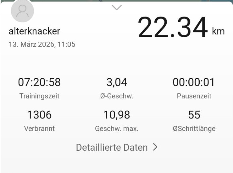 Heute mir ein selbst gegebenes Versprechen ausgeführt... Beim Start war das Wetter sehr gut, aber es änderte sich in Mäßig, stark windig. Auf den Letzten 3 Km branden die Hufe schon ganz schön. Meine Zuckerwerte hatte ich gut in Griff. Musste sogar Insulin weglassen. Ob ich jemals die 30 Km schaffe welche ich mir schon vor 5 Jahren vorgenommen hatte,kann ich nicht sagen. Aber glaube trotzdem noch daran, wenn es auch immer unwahrscheinlicher wird. MfG Ein 81 Jähriger rüstiger alter Knacker;--)) P.S. Aber es ist für mich sehr positiv das ich diese Strecke geschafft habe.