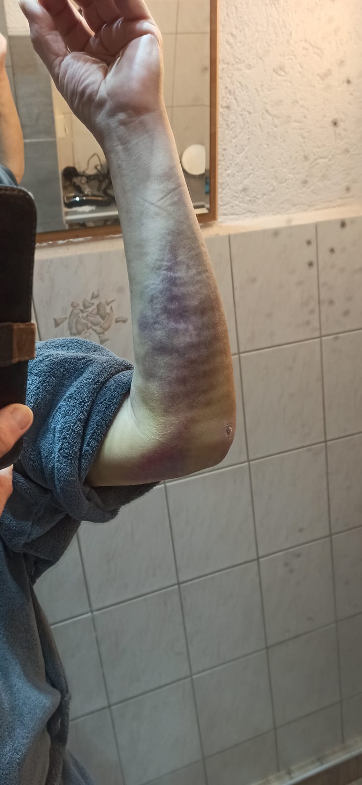 Der Sturz ist jetzt schon über eine Woche beim Entkernen her. Regelmäßige Übungen haben ergeben das keine Feinmotorische Schädigungen vorliegen. Die blauen Flecken sind aber erst seit einigen Tagen sichtbar. Bei meiner Wanderung hatte ich ein-wenig Schwierigkeiten mit den Rucksack. Das Positive ist , das alles mit Übungen schneller heilen wird. MfG ein 81 Jähriger