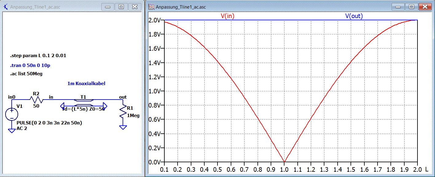 Helmut S. schrieb: > manu schrieb: >> Aber: wenn der FG bereits immer 50 Ohm als Ausgangsimpedanz hat, dann >> braucht man diese ganze Anpassung doch nicht? Oder nur weil nicht >> garantiert werden kann dass der FG genau 50 Ohm besitzt wie das Koax ? > > Leider haben die Generatoren keine genauen 50Ohm. Jetzt hängt es davon > ab wieviel frequenzbhängigen Fehler du akzeptierst. Ein Problem habe ich vergessen zu erwähnen. Wenn man am Ende der Leitung nicht abschließt, dann sieht der Generator bei der Leitungslänge lambda/4 und bestimmten Vielfachen davon einen satten Kurzschluss. Das kann den Verstärker überlasten. Das wäre bei 50Mhz bei einer Kabellänge von ca. 1m. Siehe Simulation. Bei 1m Kabellänge ist V(in) fast 0V. Da sieht der Generator einen satten Kurzschluss. Empfehlung: Mach unbedingt einen 50Ohm Abschlusswiderstand an deinen Opampeingang.