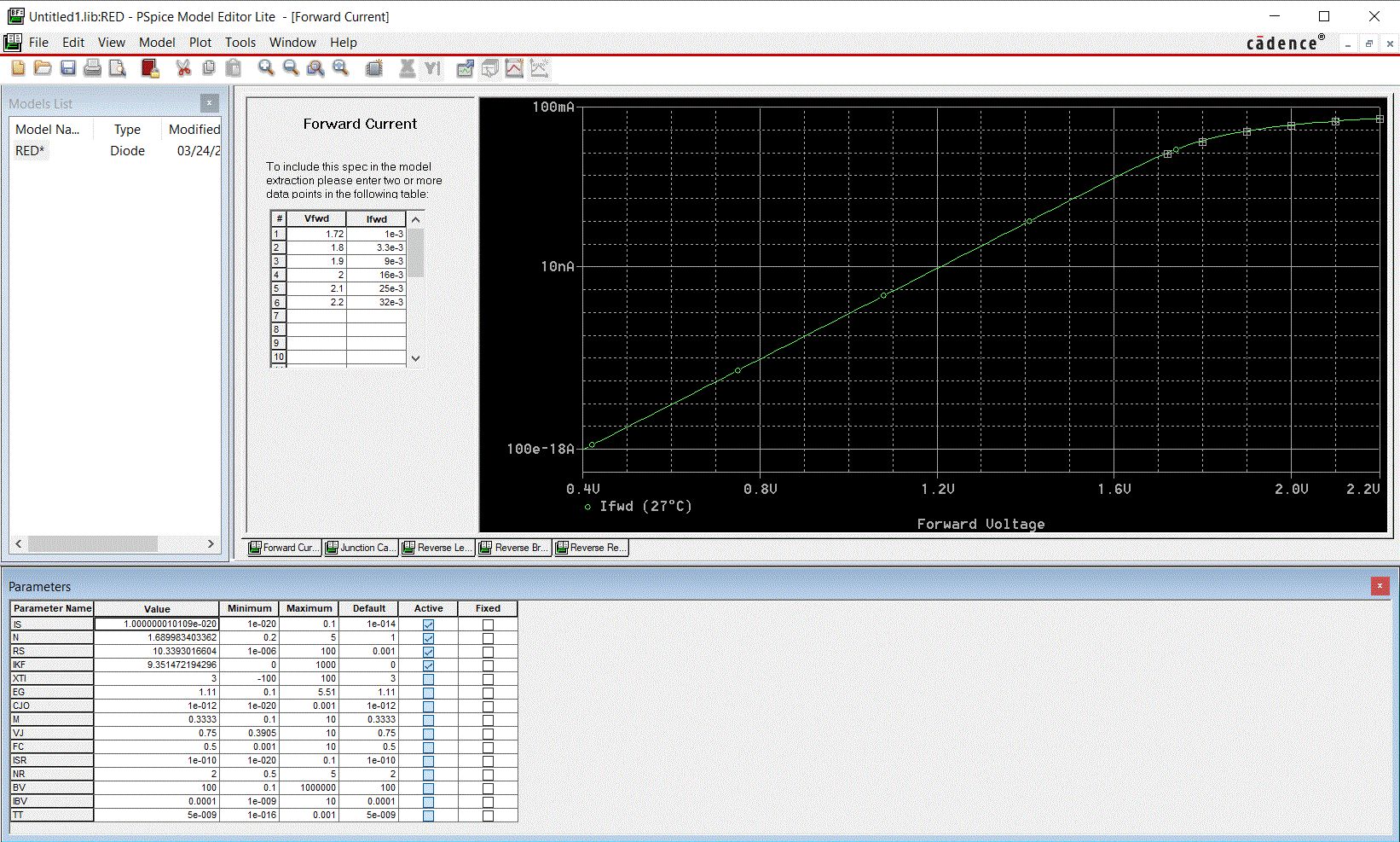 Hallo Luk, Nimm einfach den Model-Editor der PSPICE Demoversion. Entweder die aktuelle PSPICE-Demo von Cadence herunterladen oder irgend eine ältere Version aus dem Internet herunterladen oder von einer Buch-CD. Nach der Installation hat man auch einen Model-Editor. Der kann zwar nur das DC-Diodenmodell aber das genügt uns ja. Schau dir mal das Beispiel für die rote LED an. Wirklich gefittet wurde nur IS, N, RS und IKF. Alles Andere sind Default-Werte von PSPICE die man noch an Hand des Datenblattes modifizieren kann (sollte) falls das Datenblatt das hergibt. Das Modell kann man dann aus dem Programm heraus exportieren. Siehe Anhang. Den Temperaturkeoffizient könnte man jetzt noch manuell mit dem Parameter EG anpassen. Den hat der Model-Editor auf dem Default für Si-Dioden (1.11V) gelassen. .MODEL RED D + IS=10.000E-21 + N=1.6900 + RS=10.339 + IKF=9.3515 + CJO=1.0000E-12 + M=.3333 + VJ=.75 + ISR=100.00E-12 + BV=100 + IBV=100.00E-6 + TT=5.0000E-9 Das war jetzt die Turbolösung. Man kann den Fit natürlich auch von Hand machen.