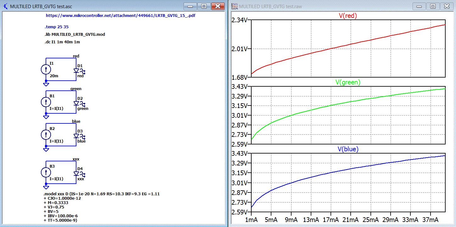 Ich habe mir nochmal die Modelle für die rote, grüne und blaue LED vorgenommen. Dabei ist mir aufgefallen, dass die Kennlinien If(Vd) für die grüne und die blaue LED auf Seite 11 exakt gleich sind. Das kann ich eigentlich gar nicht glauben. Ich vermute, dass das ein Fehler im Datenblatt ist. Du solltest mal die Kennlinie der grünen LED selber messen. https://www.mikrocontroller.net/attachment/449661/LRTB_GVTG_15_.pdf Den vom Model-Generator gesetzten Default-Parameter ISR=100e-12 habe ich herausnehmen müssen da damit die Modelle nicht mehr stimmten. Auf den Model-Generator kann man offenbar nicht blind vertrauen. Im Anhang sind jetzt die Dateien für LTspiceXVII.