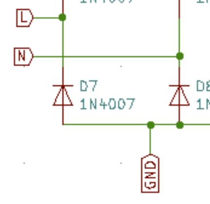 Die Ursprungsschaltung geht problemlos wenn D5,7 und 8 wegbleiben und C5 gegen eine Brücke getauscht wird bevor Gnd und N verbunden werden. "eine Niederohmige Verbindung zwischen N und GND entstehen." Während der positiven Halbwelle, bei der negativen sind dort bis zu niederohmige 320V.