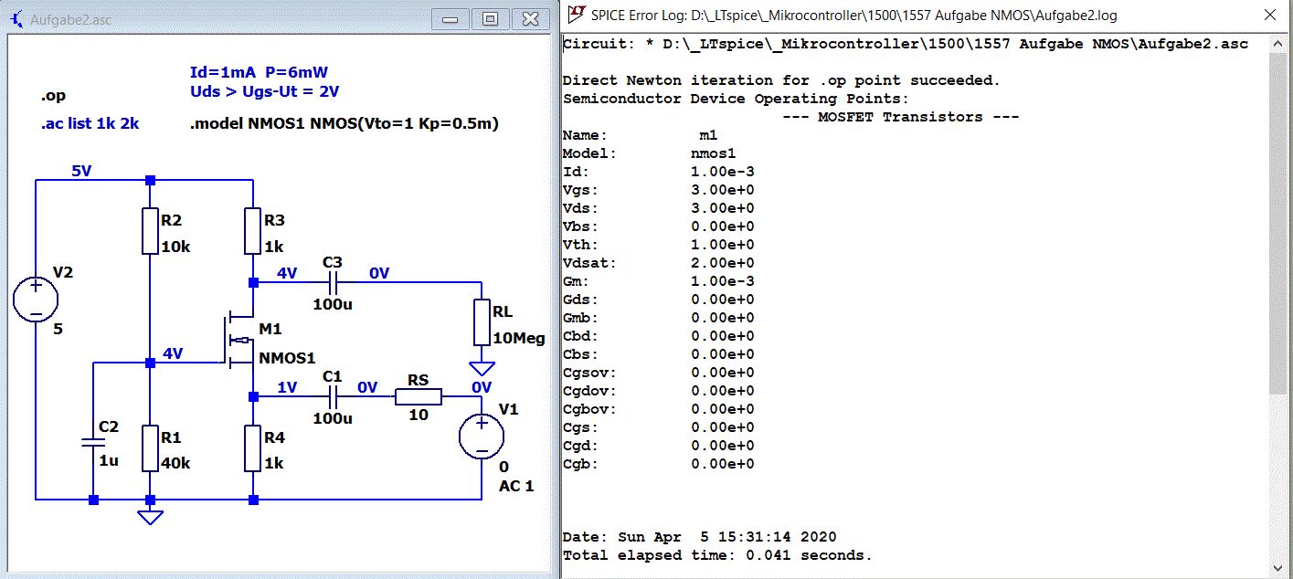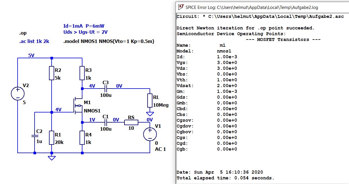 Id=1mA, P=6mW, Uds > Ugs-Ut Id = (1/2)*Kp*(Ugs-Utn)^2 Man benötigt Ugs=3V für Id=1mA. Mit R4 beginnne, z. B. 1kOhm. -> U4=1V -> Ug = 4V -> Udsat = 2V. Mit R3=1kOhm ergibt sich Uds=3V. OK! Dimensionierung siehe Anhang. Die Schaltung wurde mit LTspiceXVII simuliert.