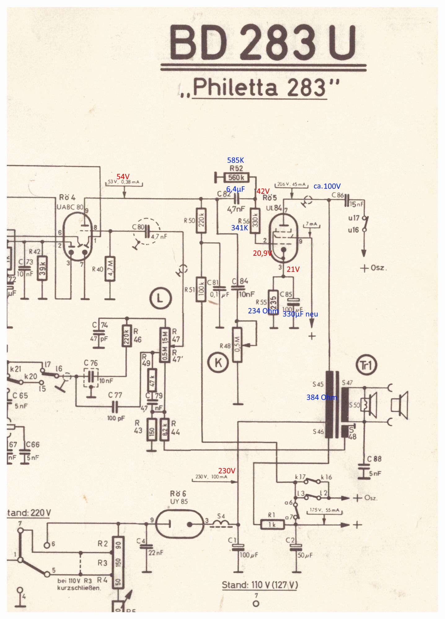 Die Röhre heißt UY85 und ist eine Diode ! Die 100µF sind da schon richtig, üblich waren um platz zu sparen Doppelelkos... Auch 100µF/50µF in einem Gehäuse. So etwas ist schwer beschaffbar. Man kann sie aber öffnen und das Innenleben austauschen! Wenn man es geschickt anstellt, bleibt das Original auch erhalten. Beispiele wie man so etwas macht findet man im Netz. Alternativ kann man die neuen Elkos so unten verbauen das man sie nicht sieht... Der alte bleibt als Deko drin.