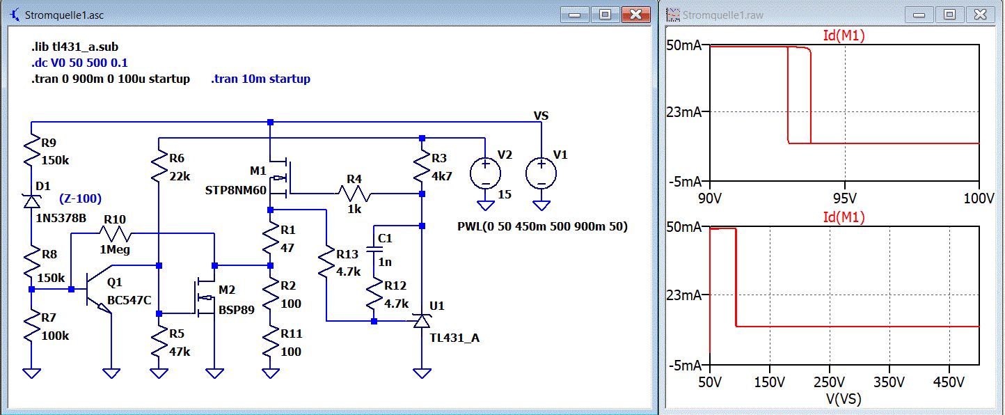 Hallo, ich mehre eben an einer Konstantstromquelle rum, die bei etwa bei 100V umschalten soll. Das macht sie auch in der Praxis. Nun wollte ich eine Hysterese mit R10 einbauen, und bin bei der Simulation völlig aufs Maul gefallen. Mit ~35 µA durch R1 muss ich nicht weiter nachdenken. Da ich davon ausgehe, dass das Problem hier vor dem Rechner sitzt, mit der Bitte um , wie ich das halbwegs selber lösen kann. Danke und Grüße