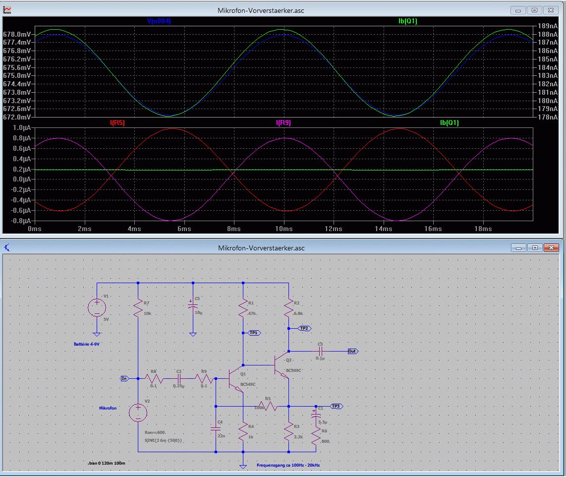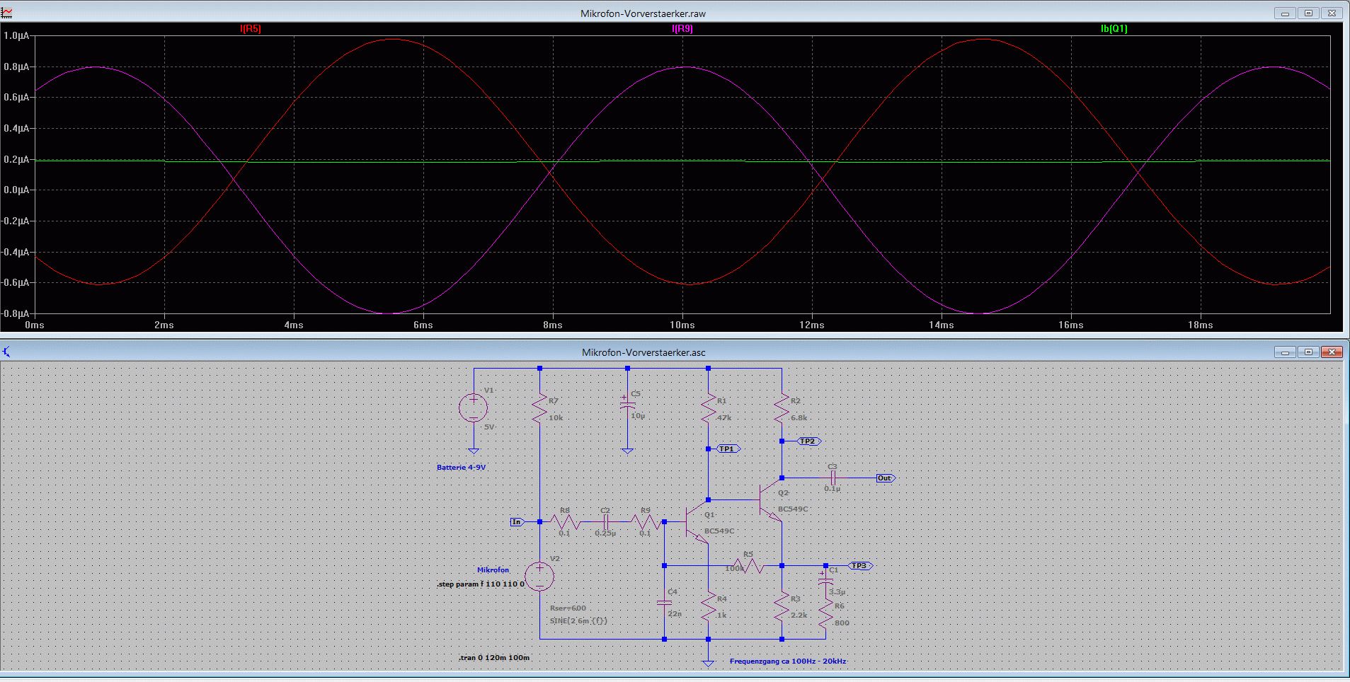 http://stefanfrings.de/mikrofon_vorverstaerker/ Frage: Welche Funktion hat R5? Nach meinem Verständnis sollte am Emitter von Q2 ein verstärktes aber um 180° gedrehtes Signal anliegen. Das Diagramm (Link auf der Seite weiter unten) zeigt ein fast vollständig geglättetes Signal V(tp3) mit einem Gleichspannungspegel von ~0,7V. (ist das Ube(Q2)? ) Diese V(tp3) wird wie gesagt 180° gedreht über R5 stark abgeschwächt auf die Basis von Q1 zurückgekoppelt, welchen Zweck hat dies? Das Diagramm zeigt für Vin kaum eine Amplitude, dagegen hat Vtp3 eine deutliche stärkere, entgegengerichtete Amplitude. M.E. ergibt sich da doch fast eine marginal zeitversetzte Auslöschung des Vin-Signals.