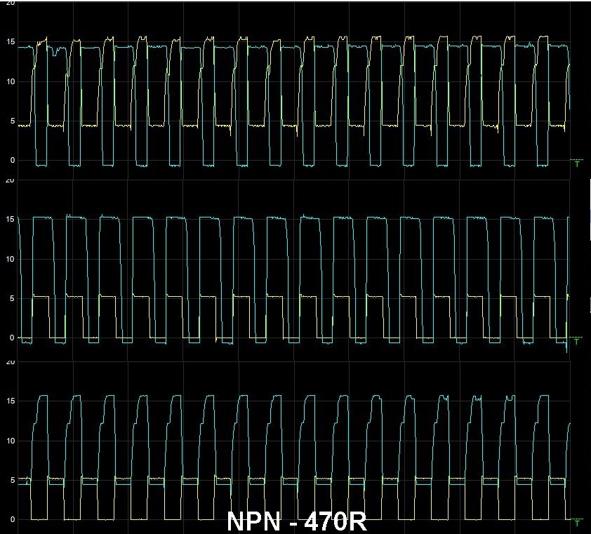 Sodele, hat etwas gedauert. Ich habe mal mit dem Skop aufgezeichnet, wie die 16kHz (50% d/c) mit dem NPN und einem Emitterwiderstand von 2k2, 1k und 470R (der Kollektorwiderstand bleibt bei 2k2) sowie mit einem BSS123 anstelle des NPN (Soruce-Widerstand überbrückt) aussehen. Jeweils von unten nach oben: PWM-Ausgang des PIC vs. Gate des P-FET (bzw. Kollektor des NPN) PWM-Ausgang des PIC vs. Drain des P-FET (Motor angeschlossen) Gate des P-FET (bzw. Kollektor des NPN) vs. Drain des P-FET (Motor angeschlossen) Und dann als 4. Kompilat: Source des P-FET vs. Drain des P-FET (Motor angeschlossen), unten mit NPN, oben mit BSS123. Die Signale am Gate des P-FET sehen schon sehr unterschiedlich aus, da wirken sich die unterschiedlichen Emitterwiderstände bzw. die Verwendung eines FET/BSS123 deutlich aus. Zu meiner Überraschung schlägt sich dies aber kaum im Ergebnis, dem Schaltverhalten des P-FET, nieder. Gut, die Flanken sind etwas steiler, aber dafür ist es auch kein 50% d/c mehr. Und entgegen meiner Befürchtung ist der Rdson des P-FET durch die geringe(re) Schaltspannung nicht so groß, daß sich dies durch einen großen Spannungsabfall auswirken würde - im Gegenteil scheint der Spannungsabfall bei Verwendung des NPN mit 2k2 fast noch geringer zu sein. So suboptimal mir die Schaltung auch erschien - anscheinend erfüllt sie hier gut ihren Zweck und kann so bleiben.