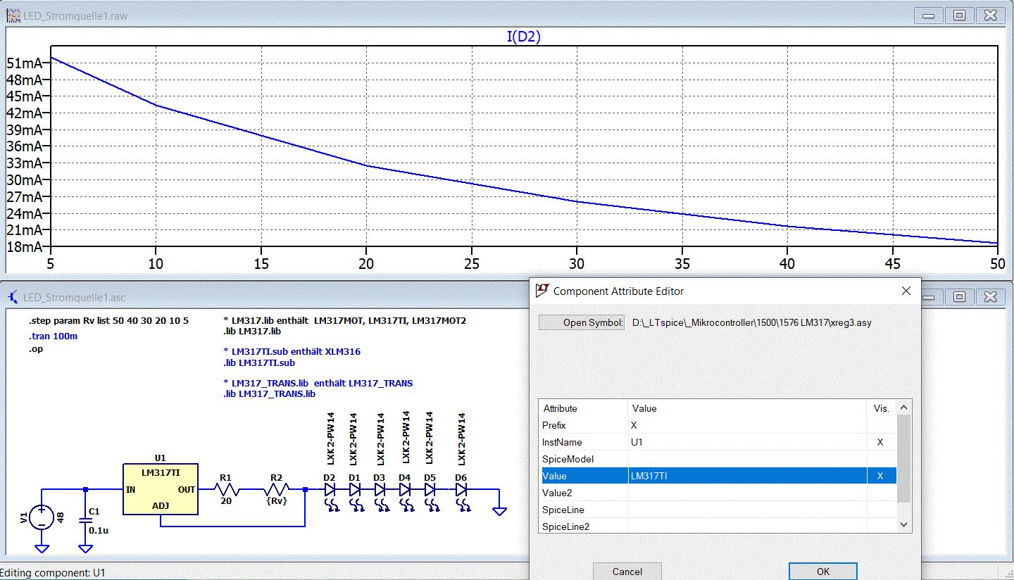 Der Dateiname in SpiceModel funktioniert so nicht. Entweder mit expliziter .lib-Anweisung (LED_Stromquelle1) oder mit eigenem Symbol mit Datei im ModelFile-Attribut (LED_Stromquelle2, LM317TI).