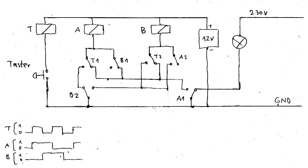 Mawins Lösung mit den Kondis scheint mir am einfachsten. Da ja ausreichend weitere bistabile Relais vorhanden sind, hat er ja sein FF :)