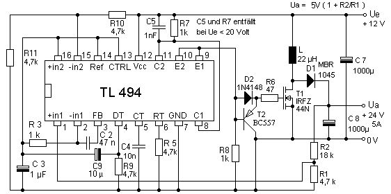 Warum googelst Du nicht einfach mal nach "TL494 StepUp"? Dipl-Ing. Jörg Rehrmann möge mir bitte das Guttenbergen seines Bildes verzeihen, aber so ähnlich sind die alle aufgebaut, evtl. mit besseren FETs und Dioden, bzw. mehrere parallel davon. Bei den FETs lohnen sich eigentlich immer zwei parallel, dann hat man nur noch ein Viertel der Verlustleistung und wenn man nicht zu schnell schaltet, fällt die zusätzliche Ansteuerleistung gar nicht auf. Es gäbe auch Tricks mit denen sich mit dem TL494 StepUp-Wandler mit Synchrongleichrichtung aufbauen lassen, dann ändert sich der Stromlaufplan deutlich. Geht aber heute ebenfalls einfacher, es gibt ICs, die das ohne Tricks von Hause aus können und zudem (im Gegensatz zum TL494) FETs direkt treiben können. Aber ich bastel recht gerne mit dem TL494, der ist zuverlässig wenn man seine Macken kennt und kann eigentlich alles. Nur für FETs braucht er eben einen zusätzlichen Transistor zum Entladen der Gates, dafür war er nicht gemacht, sondern für bipolare Transistoren bzw. bei kleinen Leistungen reichen die internen Transistoren aus.