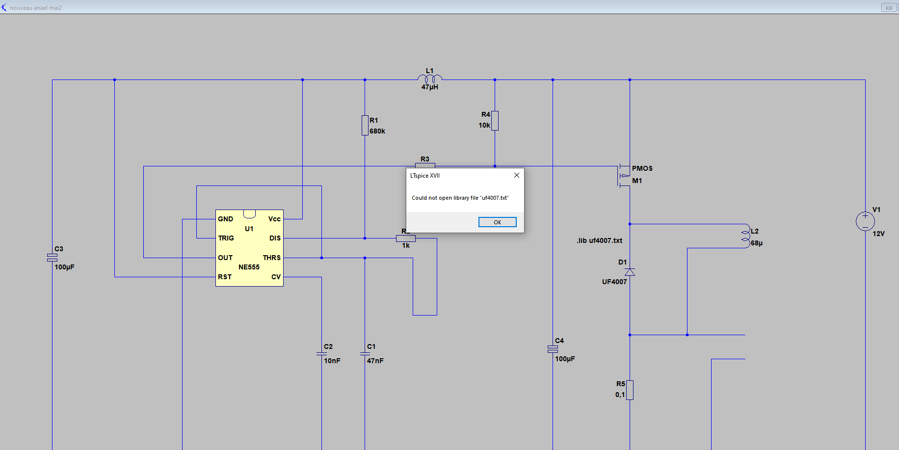 Hallo Helmut, hallo Anna. Die Schaltung ist kein Schaltregler, sondern eine kleine Testschaltung zum ermitteln des Sättigungsstromes und der Induktivität von Spulen nach folgendem Vorbild: http://staff.ltam.lu/feljc/electronics/messtechnik/simulation_ferritspulen.pdf Und wie Du schon erwähnt hast kann die UF4007 nicht einfach durch eine lahme 1N4007 ersetzt werden. Die Schaltung des Testgerät findet sich auf Seite 7 im angehängten PDF. Dort ist auch ein Modell der Diode zu finden. Ein paar Worte zu Bauteilen in den Bibliotheken von LTSPICE finden sich auf Seite 5 unten ab ACHTUNG: Was dort nicht steht, ist dass LTSPICE beim update die Originalbibliotheken wieder herstellt und Änderungen ohne weitere Maßnahmen überschrieben werden. Das ist aber im Netz hinreichend beschrieben. Gruß. Tom