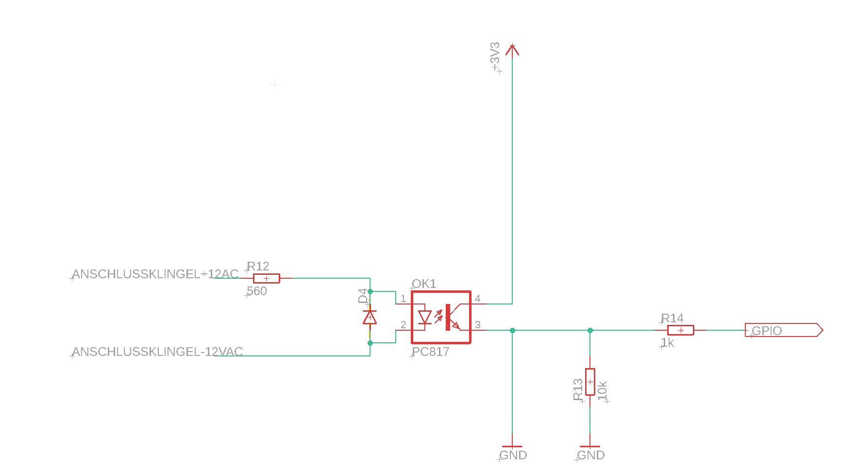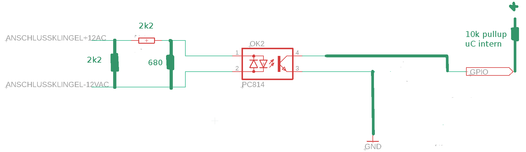 Hallo zusammen, ich bin gerade dabei an meine 12V AC Klingel einen Raspberry anzuknüpfen. Im Moment ist folgender zustand. Sobald jemand die Klingel drück wird ein 12VAC Finder Relais angesteuert, dieser schaltet dann meinen Kontakt am Raspberry PI. Diese Schaltung funktioniert ohne Probleme, allerdings soll das ganze jetzt auf eine Platine kompakter werden, damit Platz gespart wird. Oben in der Schaltung seht ihr meine neue angedachte Schaltung. Die Finder Relais sollen durch ein Optokoppler ausgetauscht werden. Der Optokoppler wird zwar durch die Schaltung öfters schalten, aber dies würde ich Softwareseitig ignorieren. Was haltet ihr von dieser Schaltung? Würdet ihr etwas anderes machen und wenn ja wie ? Viele Grüße P4ly