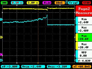 Ok, dann lass das mit dem Labornetzteil. Es hätte helfen können, herauszufinden, wie viel Strom du mehr brauchst. 7A sind auf jeden Fall mehr, als die 5A die dein Netzteil liefern kann. Ändere mal die Zeitachse so, dass man den Abschaltmoment besser sehen kann. Wenn das Netzteil abschaltet, müsste die Spannung in diesem Moment viel weiter absacken, als das Bild zeigt. Das kann ja auch sein. Du hast an dieser Stelle vermutlich einfach nur zu wenig Abtastpunkte, um es richtig sehen zu können. Mache die Zeitachse mal um Faktor 10 oder 20 schneller und triggere auf dem gelben Kanal fallende Flanke bei 19V. Dann sehen wir, wie weit es wirklich in den Keller geht. Falls das Gerät nur auf dem anderen Kanal triggern kann, tausche halt die Eingänge.