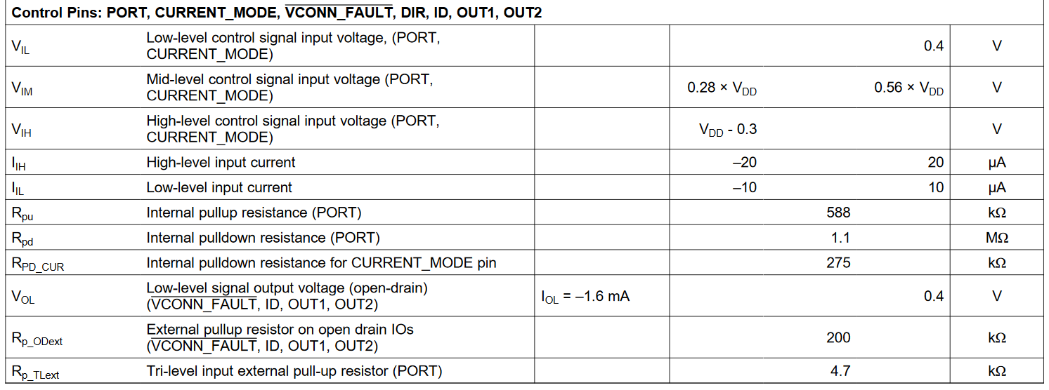 Hallo, ich verwende als CC-Controller für USB-C der TUSB321 http://www.ti.com/lit/ds/symlink/tusb321.pdf als DFP. Der TUSB hat dann 3 open-drain Ausgänge, nämlich #VCONN_FAULT, DIR und ID an die ich gerne LEDs hängen möchte, allerdings werde ich aus dem Datenblatt nicht schlau. Bisher habe ich an #VCONN_FAULT und ID jeweils einen 200 kOhm Pullup und an DIR einen 10 kOhm Pullup. Die Signale gehen dann in das FPGA und werden dort korrekt erkannt. Jetzt würde ich in Serie zu jedem Pullup noch gerne eine LED schalten und den Pullup dann auf z. B. 4.7 kOhm verringern. Ich verstehe das so, dass der open-drain Ausgang dann durchschaltet und Strom durch Pullup und LED fließt, die LED also leuchtet und das Signal ebenfalls Low ist. Im Datenblatt stehen aber nur sehr kleine Werte für I_IH und I_IL. Das verwirrt mich, ich hätte vermutet, dass ein open-drain Ausgang doch mehr Strom aufnehmen kann. Seltsamerweise steht in dem Datenblatt auch in der 3. Zeile von unten einmal I_OL= –1.6 mA. Diese Spalte heißt TEST CONDITIONS und ist sonst leer. Kann ich also annehmen, dass wenn ich da einen Stromfluss von 1.6 mA in Richtung TUSB321 erlaube, dass dann die Spannung noch 0.4 V beträgt? Und ausserdem kann ich ja bei open-drain Ausgängen die Spannung an den Pullups variieren. Wenn ich das also an eine 1.8 V FPGA Bank anschließen will brauche ich keinen Pegelwandler, sondern nehme einfach Pullups nach 1.8 V. Damit dann 1.6 mA fließen müssten diese den Wert 1125 Ohm haben. Wenn ich da also 1.2 kOhm verbaue sollte das passen für LED und FPGA Signal. Sehe ich das richtig? Vielen Dank!