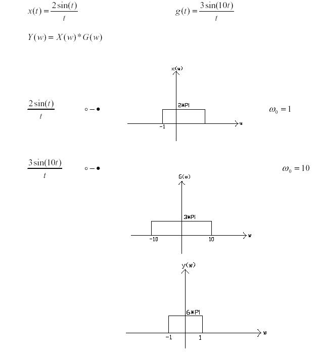 Faltung im Zeitbereich ist Multiplikation im Frequenzbereich. rx(w) -> Rechteckfunktion von -x*w..+x*w X(w) = 2*Pi*r1(w) G(w) = 3*pi*r10(w) Y(w) = X(w) * G(w) = 6*pi^2*r1(w) Weshalb kommen da nur Frequenz von -w..+w raus? G(w) ist im Prinzip nichts anderes als die Übertragungsfunktion des Systems im Frequenzbereich. Die Impulsantwort ist die Antwort des Systems auf einen Impuls im Zeitbereich. Ein Impuls im Zeitbereich enthält alle Frequenzen von -inf..+inf. Fourier(dirac(t)) = 1. D.h. man gibt alle Frequenzen auf das System und es kommen nur die Frequenzen von -10w..+10w wieder raus. Da X(w) aber nur Frequenzen von -w..+w mitbringt kommen auch nur die raus. P.S. Viel Spass am Donnerstag. ;-)