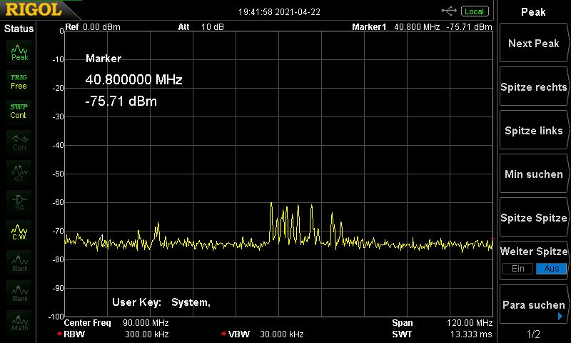 Achso, klar, die Oberwelle des Basistakts, den hatte ich vergessen. Nun, die wird ja dann hoffentlich nur von der Platine irgendwie abstrahlen, nicht über das Ausgangssignal. Das erklärt natürlich auch den Peak bei 30 MHz, aber nicht den bei 50.