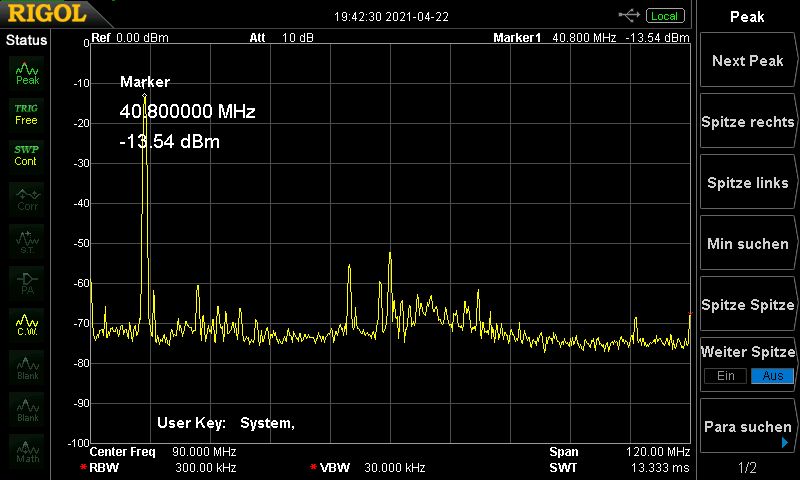 Wenn du es ganz genau machen willst, kannst du am Ende auch noch eine gestrahlte Messung machen: deine für den Betrieb vorgesehene Antenne dran, am Specki eine Breitbandantenne (die allerdings hier schon unhandlich groß wird) und damit schauen, dass deine Sendeantenne nicht gerade versehentlich den Oberwellenabstand verschlimmbessert. Randy B. schrieb: > Und dann ist es ein Versicherungsfall Naja, dafür müsstest du schon heftigen Schaden anrichten. ;-) Wenn dein Aufbau die gleichen Werte bringt wie der von Mario und mir, ist das in keiner Weise zu erwarten (natürlich solltest du dich auch an die übrigen Bedingungen der Allgemeinzuteilung halten, insbesondere die zugeteilten Frequenzen – die sind auf 40 MHz ja nicht lückenlos).