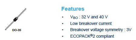 OK, ich habe eben das Datenblatt von ST gefunden ... es gibt nur einen Typ Diode DB3 (Siehe Bild). OK, ich bestelle nun erstmal und wenn die Reparatur erfolgreich war, berichte ich hier wieder. Einen schönen Feiertag noch an alle und vielen Dank für`s Helfen! Dirk