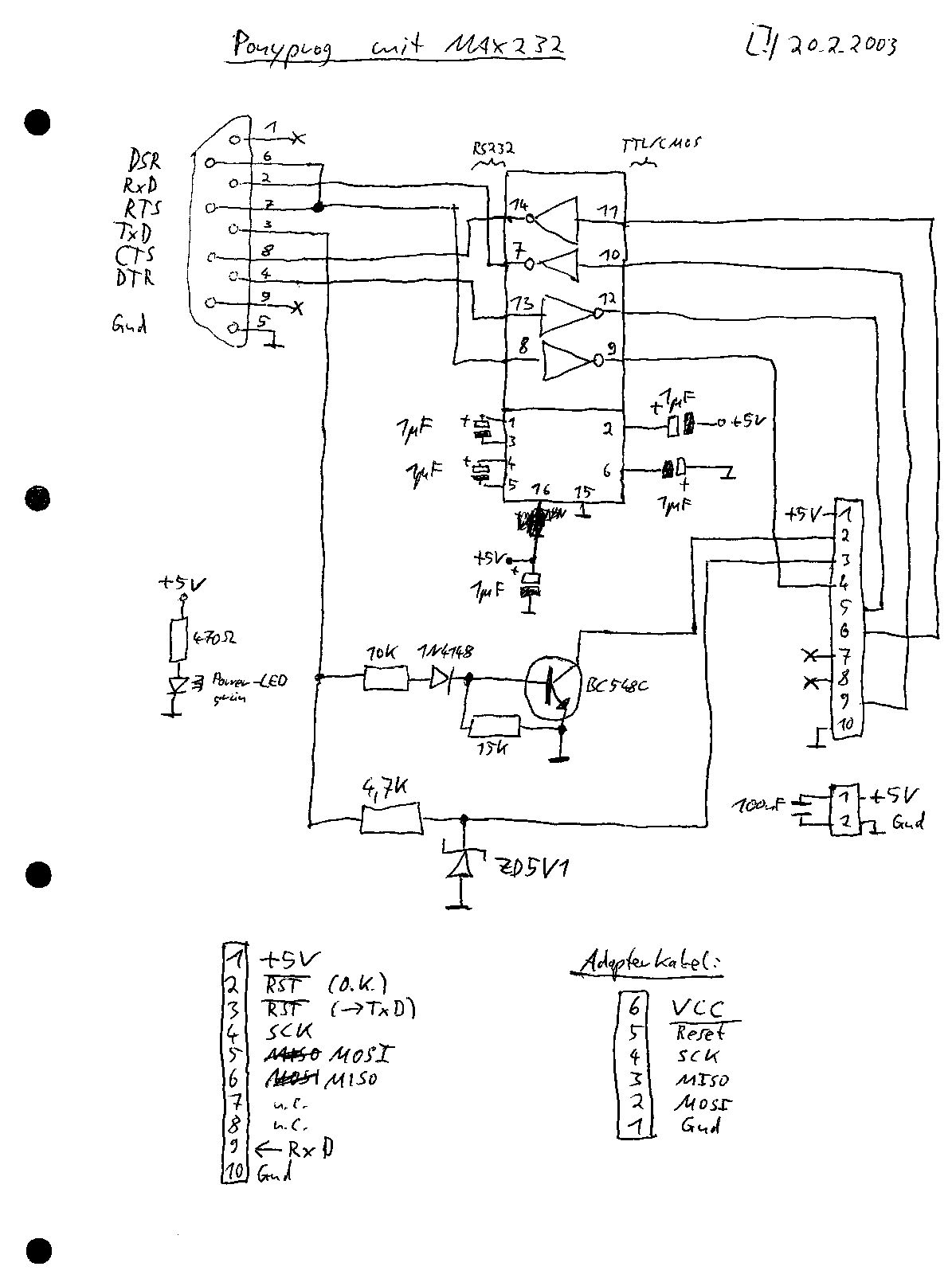 OK, ich habe den Schaltplan mal eingescannt und hier angehangen. Natürlich benötigt so ein MAX232 richtige 5V zur Pegelwandlung und benötigt daher unbedingt eine externe 5V Spannungsversorgung, die natürlich im ISP-Fall auch von der Schaltung abgegriffen werden kann. Ferner ist diese Schaltung warscheinlich nicht mehr zu allen Ponyprog-Adaptern kompatibel, da für PIC-Programmierung keine 12V Spannung oder soetwas zur verfügung gestellt wird. Trotzdem sollten damit alle normalen Atmel-µC's Programmierbar sein. Die Reset-Leitung wurde nicht über den MAX-232 geführt, sondern ganz nach dem Original mit einem Transistor betrieben. Durch die Umsetzung der CMOS-Pegel in echte RS232-Pegel wird eine deutlich sicherere Datenübertragung vom µC zum PC gewährleistet und das ISP-Kabel zwischen Ponyprog unt µC darf nun deutlich länger sein. WICHTIG: -------------------------------------------- Damit diese Schaltung unter Ponyprog funktioniert, müssen wegen den durch den MAX232 invertierten Pegeln folgende Einstellungen unter "Setup" -> "Interface Setup..." gemacht werden: Invert D-IN aktivieren Invert D-OUT aktivieren Invert SCKL aktivieren Invert RESET _de_aktivieren Ponyprog neigt bei mir übrigens dazu, diese Einstellungen bei jedem Neustart wieder zu vergessen.... PonyProg als RS232-Konverter: -------------------------------------------- Wer gerne mit der AVR-UART arbeitet, kann an Pin2 vom Ponyprog einen Pullupwiderstand einsetzen (200Ohm - 1K) und erhält so ein richtig invertiertes TxD-Signal vom PC, was direkt dem RxD vom µC zugeführt werden kann. Noch einfacher ist es in der anderen Richtung: Der beim Ponyprog nicht benutzte Pin9 kann direkt mit der TXD-Leitung des Prozessors verbunden werden, da meine Version hier eine echte RS232-Wandlung vornimmt. Lutz