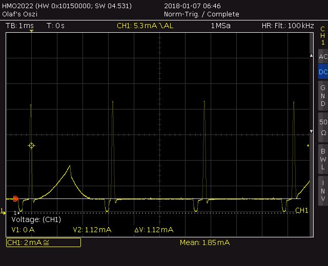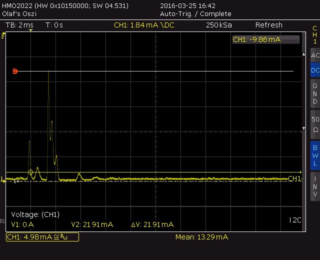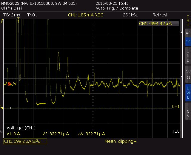 Hier noch was schönes. Das Bild zeigt eine BLE Verbindung mit einem 51822 der gerade AD-Daten überträgt. Ich hatte da einen fetten Elko für die Messung angehängt. Ausserdem noch mal ein Ausschnitt ohne Elko und nochmal mit aufgedrehtem Oszi, also 200uA/div. Macht schon Spass sowas zu haben, gerade wenn man selber programmiert und man so genau verfolgen kann was kleine Aenderungen fuer auswirkungen haben. Olaf