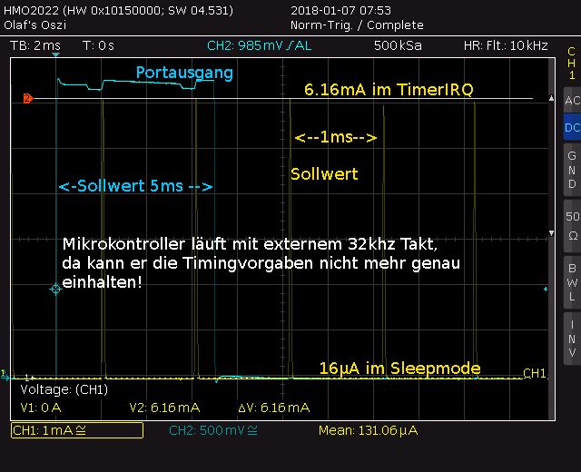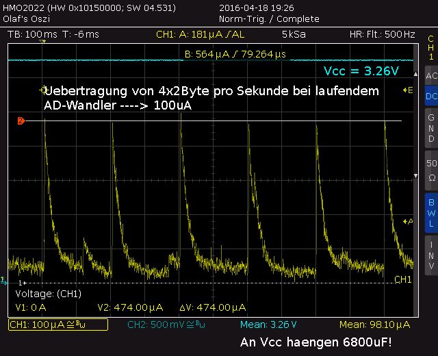 > Ein Anschluss an einem µC erfolgt über I2C. --> Speicherung der > Messwerte möglich Das ist doof. Es ist VIEL besser es auf dem Oszi zu sehen damit man die anderen Kanaele und triggermoeglichkeiten hat. > Nö, da ersetzt man einfach die Batterie (wie oben geschrieben wurde) > durch einen Kondensator und guckt wie weit man damit kommt. Heute ist nicht dein intelligenter Tag oder? .-) > Letztendlich ist doch nur wichtig, ob das Produkt lange genug laufen > wird. Ja, aber der Weg dahin ist wichtig. Ich moechte sehen was passiert wenn der Mikrcontroller bestimmte dinge einschaltet. Ich will sehen wie lange es braucht bis die Versorgung bestimmter Messhardware hochgefahren ist, wann eine Messung abgechlossen ist. Wie gross der Leistungsverbrauch in dieser Zeit ist. Ob es sinnvoll ist z.b Spannungslagen anders zu waehlen. Daran kann man abschaetzen wo man was optimiert und wo nicht. Hinzu kommt noch das komplexere Hardware ihr Verhalten je nach verfuegbarer Energie ändert. Olaf