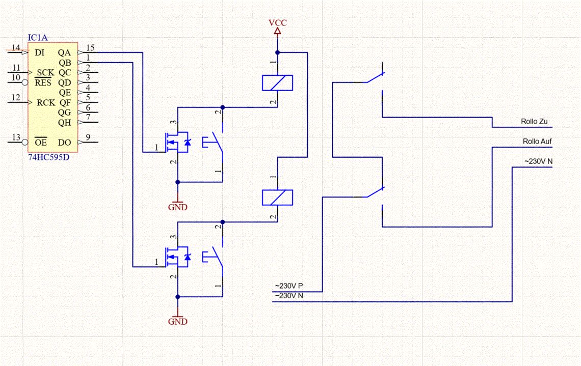Hallo, liebe Grüße euch allen. Vorab bitte ich um Entschuldigung für meine Einmischung. Das ganze hin und her mit den Relais bringt nicht viel, bis daran gedacht wird, dass da Motoren geschaltet werden. Dazu noch mit 230V und sehr vielen Amperen zu mindest zum Zeitpunkt des Einschaltens. Für so etwas wurden eigendlich Schütze entwickelt und verwendet. Also vor vielen Jahren hatte ich so ein Problem. Motor für Beamerabsenkung, der kam aus der Decke, lief nach wenigen Schaltperioden durch, heiß und die Schutzsicherung erfüllte ihren Dienst. Relais war kaputt, wurde ausgetauscht und das Spiel begann von neuem. So, kurzer Weg, solche kleinen Relais,auch wenn sie nicht aus China kommen, brennen fest. Sehr wahrscheinlich durch den Abrissfunken. Der Motor ist wie die Zündspule beim Auto, nur mit mehr bumms. Die Relais sollten ca. 30 bis 50A , besser mehr, schalten können. Oder SSD für induktive Lasten. Besser auf Altdeutsch, mit den kleinen Relais entsprechende Schütze schalten. Eine solche Schaltung läuft seit 1986 Fehlerfrei bei fast täglicher Nutzung. Ach so, D1 und D2 sind doch Ausgänge am ESP, richtig? Und warum will man diese unbedingt mit den Tastern kurzschließen beim Betätigen von diesen? Diese Ausgänge haben nun mal entweder 3,3V oder GND. In einem der beiden Fälle werden sie kurzgeschlossen. Ich hoffe, ich konnte ein wenig helfen. Euch noch schöne Grüße aus der Nacht. Bernd