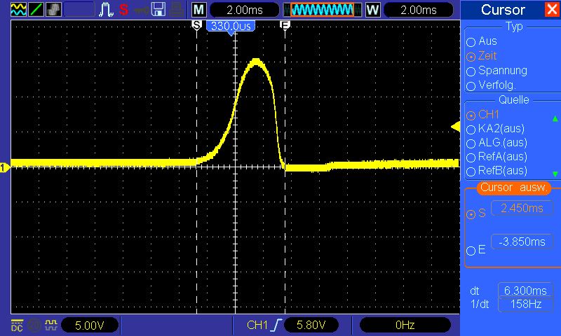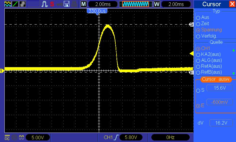MaWin schrieb: > Dann bau ihm ein und vergiss Sicherung und Motorschutzschalter. Ok. MaWin schrieb: > Noch ungünstiger weil aussen die Wärme abgeführt wird, hier eher ein 70 > GradC und damit noch weniger Belastbar Na gut, dann halt nicht. Dachte halt nur, dass das Blech so wärmeleitfähig sei, dass der Temperaturunterschied nicht so groß wäre. Egal. kommt halt einer in die Wicklung. MaWin schrieb: > So ganz klar ist mir dein Bild nicht. Ich würde beim Einschalten 2 > Phasen erwarten, mit Vorwiderstand und dann mit überbrücktem > Vorwiderstand, und in den Phasen abklingenden 50 Hz Wechselstrom. Das hätte ich auch erwartet. Teilweise gibt es noch einen kleinen Überschwinger nach unten und dann ist alles vorbei. Ich kann leider auch nicht erkennen, wann genau das Relais einsetzt und überbrückt. Laut Finder hat das Relais eine Ansprechzeit von 7-12ms. Sollte also genau da reinhauen, wenn alles vorbei ist und man sieht es deshalb nicht? > Dein Bild sieht so aus als wäre nach 4ms alles zu Ende. > >> 80 A > > 325V / 16 Ohm sind schlimmstenfalls 20A, es könne keine 80A sein. Verstehe ich auch nicht. Ist etwas an meiner Messung falsch: Stromwandler AC1020 (ok nur nominal 20A geeignet, aber geht bis 60A primär) An die Sekundärseite des Wandlers nur einen 220 Ohm Widerstand gelötet und dann mit dem Oszi abgegriffen. Ist da was falsch dran?