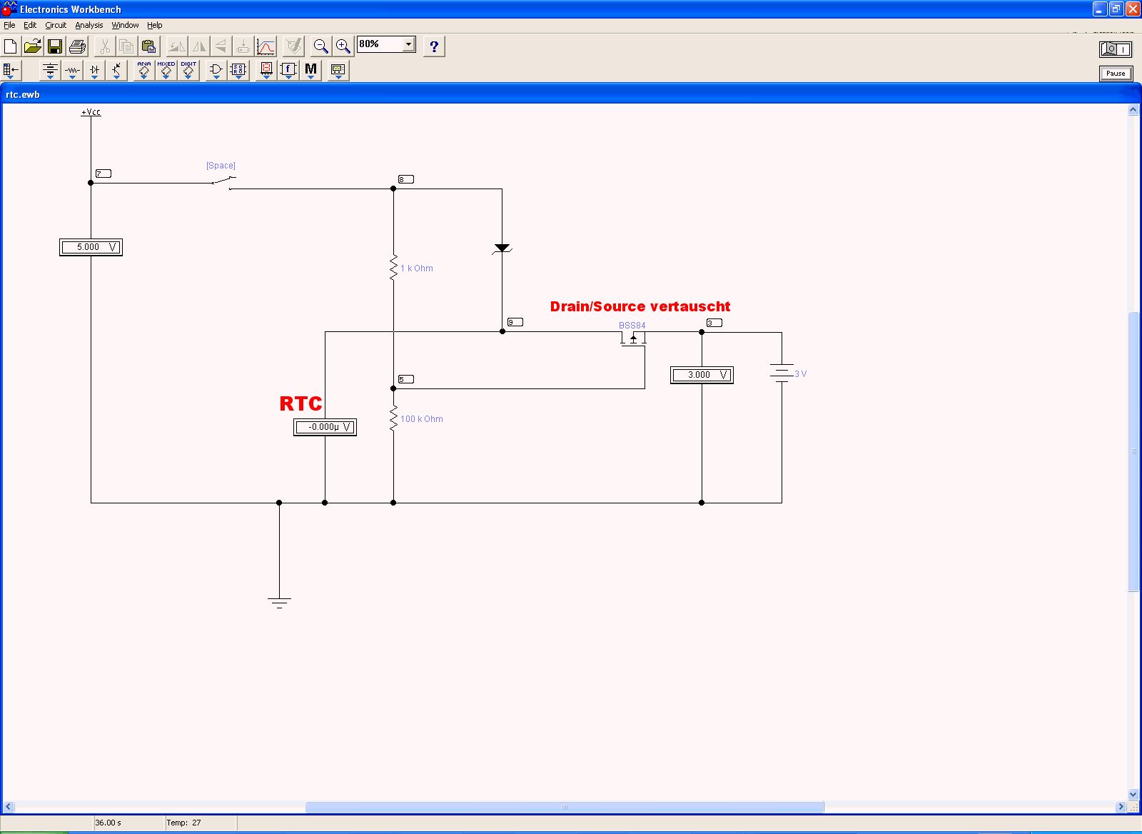 Gerhard schrieb: > Drain und Source ist vertauscht! Dachte ich auch schon. Laut dem zitierten Beitrag wäre dem nicht so. Hab es in EWB mal getauscht - hat nix verändert. BTW: Innenwiderstand des RTC Voltmeters war 1M. Auf 100 Ohm gesenkt hat nichts bebracht.