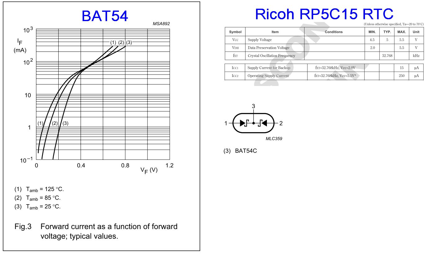 So >1 Jahr später... Statt der BAS54AL habe ich auch eine LL103 genommen. Damit funktioniert es. Der Spannungsverlust am Vcc des RTC war wohl bei 4,7..4,8V vor der Diode zu hoch, als dass ein sicherer Betrieb noch möglich wäre. Macht es Sinn statt der zwei LL103 eine BAT54C zu nehmen? Im Bild die (hoffentlich) essentiellen Infos zur Frage.