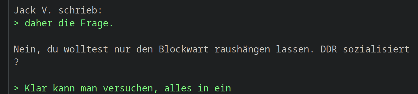 Michael B. schrieb: > Nein, du wolltest nur den Blockwart raushängen lassen. DDR sozialisiert > ? Laberkopp labert wieder dümmlich daher. Aber wie man ausgerechnet an genau diesem einen Satz von Dir sieht - genau deswegen (als Beispiel) ist Plenken eher Blödsinn.