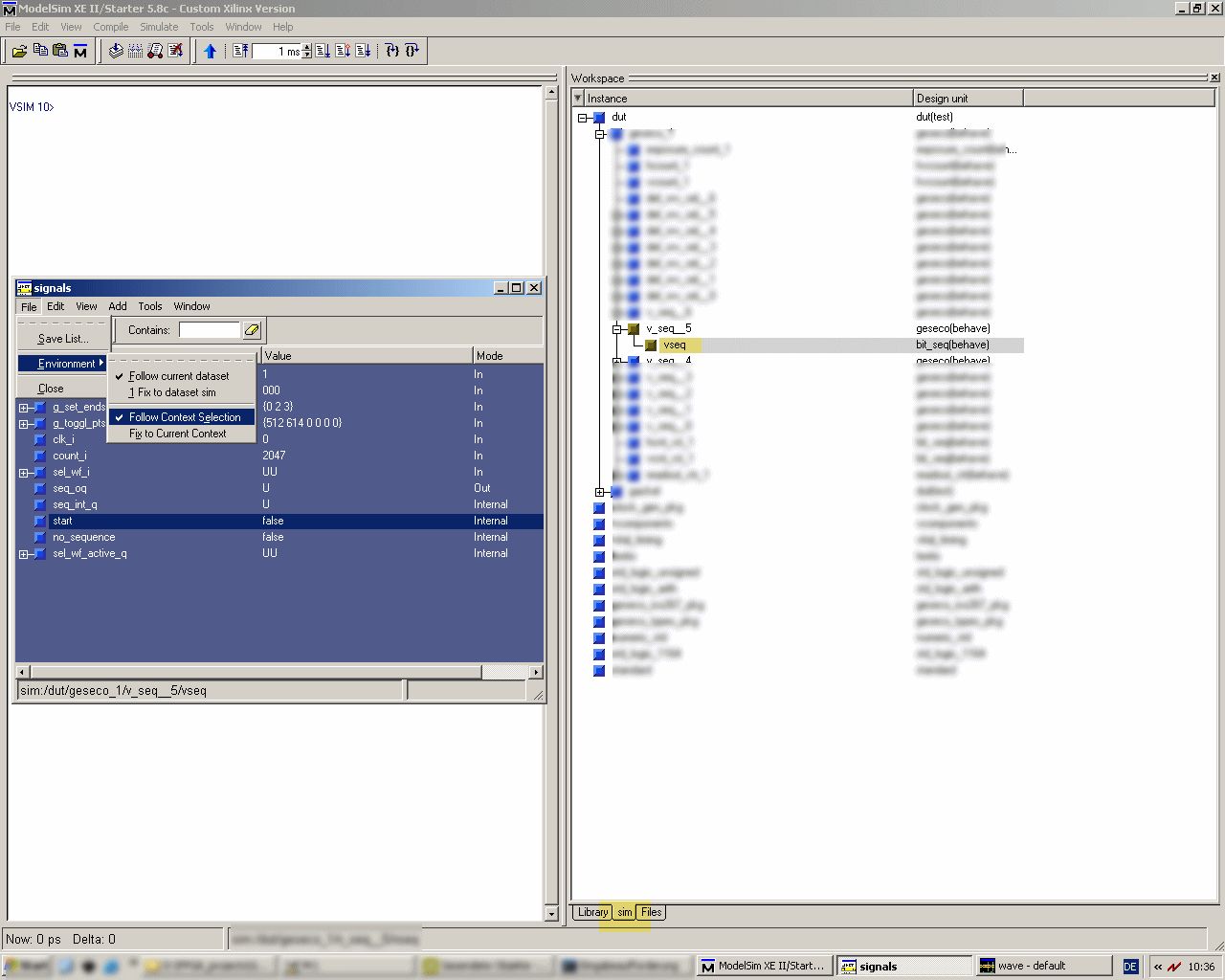 Hm, also modelsim zeitgt sehr wohl interne Signal und Ports von instanziierten Komponenten an. Allerdings muss man dazu in mehreren Fenstern klicken, das ist etwas unübersichtlich. Hier mal die KlickKlacki Anleitung, siehe beigefügten screenshot: -Lade ein design -> im fenster Workspace erscheint unten ein Kartereiter sim (im screenshot orange markiert). -Klicke diesen an -> du bis im Instanzbrowser -Öffne das "signal -Fenster" (View-> Signals) -Überprüfe die Einstellungen File -> Enviroment (siehe Screenshot) -Wenn diese stimmen kannst du jetzt im Instanzbrowser durch Klicken auf die Kästchen mit dem Plus oder auf den Namen der Instanz (neben +) in der Hierarchie in die tieferen (internen) komponenten "hinabsteigen" -im Signalfenster werden jetzt die Signale,Ports zu dieser internen Komponente angezeigt. -im signalfenster kanns du nun per Add -> Wave -> selcted signals ausgewählte Signale dem Wave-fenster hinzufügen (Evtl. sollte das Wave fenster vorher geöffnet sein. -Im transcript fenster (im Screenshot links neben fenster workspace) wird das tcl Kommando für diese Aktion angezeigt (nicht im screenshot). Das kannst du in dein script schreiben.