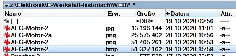 So, Test ist durchgeführt... Ausgang das Bild vom Motorschutzschalter in 600 dpi BMP Wir sind uns einig, dass das die tatsächlichen Pixel und Farbinfos vom Scanner, ohne irgendwelche Bearbeitung sind. Dann gespeichert als PNG ohne Kompression, nochmal mit voller Kompression und zum Schluss als JPG in "hoher" Qualität. Dateigrößen:(PNG-BMP-JPG-Groessen.bmp) PNG ohne Kompression ist also rößer als BMP! Dabei ist die Qualität (also vor allem die Bildschärfe) schon etwas schlechter. Bei voller Kompression ist das PNG nur noch halb so groß, doch schon sichtbar vermatscht (s. Vergleichsbild). Anders bei JPG! Die Dateigröße schrumpft auf rund ein Viertel und die Detailschärfe ist um Welten besser, selbst die Papierstruktur ist noch in Teilen sichtbar. Das Vergleichsbild zwischen JPG und stark komprimiertem PNG (PNG-vs-JPG.bmp) oben habe ich extra in BMP gespeichert, um nicht dadurch wieder Verluste zu haben. Das Ganze wie immer mit IrfanView, damit mach ich fast alles (ok, für "richtige" Fotos nutze ich RAW in Lightroom 6 ;-)))) Old-Papa Mist, die Forensoftware verkleinert das 2. Bild zu stark... Ich habe es hier abgelegt http://www.old-papa.eu/Dokumente/PNG-vs-JPG.bmp