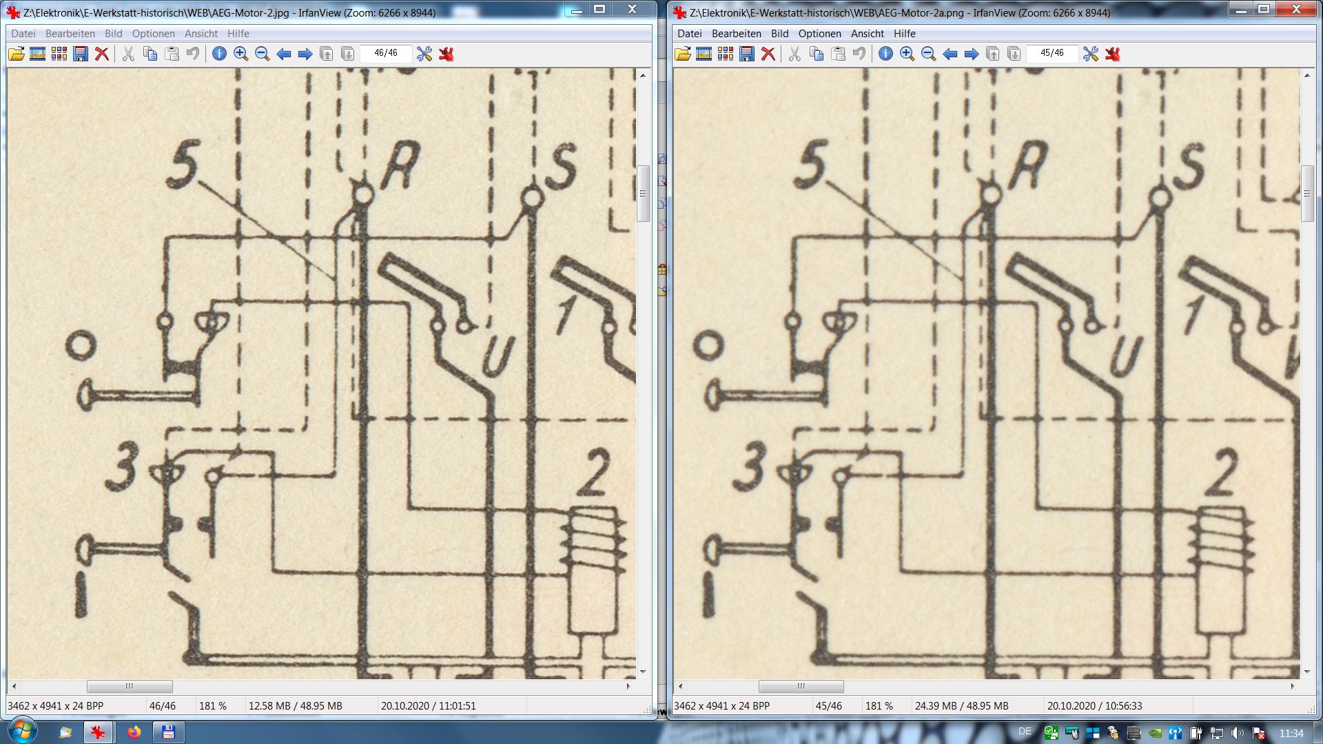Bernd G. schrieb: >> Drei Auflösungen habe ich generiert, wobei >> die höchste eine 1,2GB-Datei erzeugt hat. > > Beim nächsten Mal vllt das djvu-Format probieren? Nö, auch bei diesem wird bei hochauflösenden Daten halt der Platz gebraucht. Reduzieren geht ja immer, doch auch immer auf Kosten der Lesbarkeit. Hier ein Auflösungsvergleich der Innenschaltung der AEG-Motorschalter von den letzten Seiten und dem eigentlichen Original (aber schon als JPG) Old-Papa