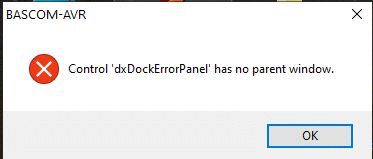 Welches Betriebssystem wird verwendet? Welche Version von BASCOM wird verwendet? Handelt es sich um die Demo oder Vollversion? Du hättest auch erst mal im Support Center von MCS suchen können! > Problem: > After an update you get an error 'Control dxDockErrorPanel has no parent window' > > Solution: > New versions can contain new dock panels. The configuration is not correct when you update from an old version. > Solution : click the Options, Environment, IDE and then click 'reset docking' button. > This will reset the dock windows.