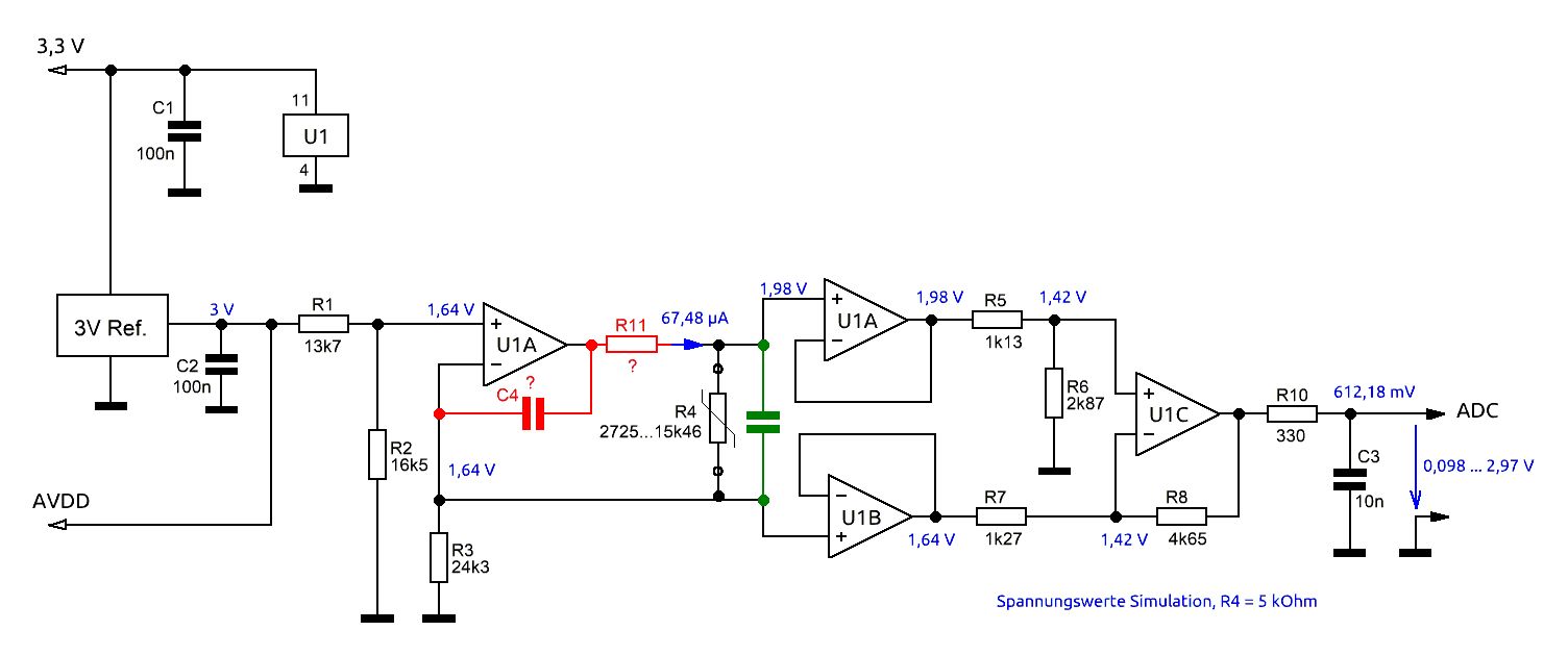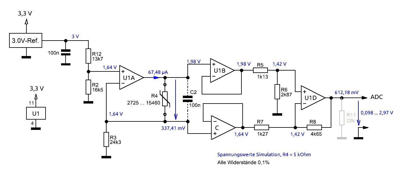 Mit einem relativ genauen NTC (0,13°C) möchte ich einen Temperaturbereich erfassen und den gemessenen Analog-Wert an einen ADC (12-Bit) weiterleiten. Mit TINA-TI (Spice Simulator von TI) habe ich die Schaltung simuliert und aufgebaut, alles funktioniert soweit. Es gibt aber ein paar Anforderungen an die Schaltung und ich würde gerne von HW-erfahrenen wissen, ob das so in Ordnung ist oder Probleme geben kann. Der NTC ist an einem Kabel (Zwillingslitze) angeschlossen, dass diverse Meter lang ist. Demnach holt man sich auch (Brumm-)Störungen mit rein. Damit die aber keinen Einfluss haben, soll der NTC symmetrisch angeschlossen und gemessen werden, ich denke das das so funktioniert. Abgekuckt habe ich mir das übrigens aus dem schon wat älteren und langen Thread hier: Beitrag "Temperaturmessschaltung möglichst genau?" Da ging es aber um einen PT100, der im Gegensatz zum NTC eine lineare Temperaturkurve hat. Der OP ist ein 4-fach Rail-to-Rail Typ (In/Out) und der erste (A) Teil erzeugt den Konstantstrom, lt. Simulation 67,5 µA, was auch mit der Realität so ziemlich genau passt. Der NTC verändert seinen Widerstand im Temperaturbereich von 2725 bis 15460 Ohm. Die OP's (B) und (C) dienen der Auskopplung um den Messwert nicht zu verfälschen. Der D-Teil macht 2 Dinge, zum einen ein wenig Verstärkung (Faktor ca. 3,3) und zum anderen die Offset-Spannung möglichst nahe auf Null bringen (R4 = 2725 Ohm) um im gem. Temperaturbereich einen Spannungshub von annähernd 3V zu bekommen. Alles was mit der Messung zu tun hat wird mit der 3V Spannungsreferenz versorgt (Konstantstromquelle) und sind 0,1% Widerstände. Am Ausgang ist ein 12-Bit ADC angeschlossen. Die Temperatur soll mit einer Genauigkeit von 0,13°C erfasst werden evtl. wäre auch 0,2°C noch akzeptabel. Versorgt wird alles mit 3,3V (single supply). Ich weiß nicht, ob z. B. der Kondensator am Eingang (parallel zum NTC) sinnvoll ist oder ob man drauf verzichten kann oder, sollten aus irgendwelchen Gründen hohe Frequenzen ein Störfaktor sein, ob man einen Tiefpass irgendwo beim D-OP einbaut. Weil Temperaturänderungen relativ langsam sind, will ich mit vllt. einer Messung pro Minute messen, wobei es vllt. sein kann, dass z. B. 10x hintereinander Messwerte abgefragt werden und dann ein Mittelwert gebildet wird, mal sehen wie es wird. Dann ist da noch das Thema Störungen auf der Versorgungsspannung (3,3V). Muss da was dran getan werden? Fällte jemanden noch was auf, was suboptimal ist? Was übrigens nicht geht, sind Dinge wie ein manueller Nullpunktabgleich oder sowas.