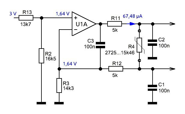 Anja schrieb: > Vermutlich schwingt die Stromquelle. -> versuche mal einen kleinen > Serienwiderstand zwischen Stromquellenausgang und NTC. Und ggf einen > Kondensator zwischen Ausgang und negativem Eingang. Dass die Stromquelle schwingt, kann sehr gut sein, denn ich hatte mit nur einem Kondensator am Eingang parallel zum NTC (R4) Digit-Werte, die waren jenseits von allem, was ich gebrauchen kann. Und in einem Fall hatte ich Werte, die waren innerhalb des Messbereichs, aber die Schwankungen lagen bei ca. 200 Digits. Wenn ich zwei Kondensatoren zufüge, mit jeweils einem Bein jeweils am NTC und dem anderen an GND (Gehäuse habe ich noch nicht), habe ich wieder Messwerte außerhalb des Bereichs. Im Bildchen oben habe ich mal deine Vorschläge reingemalt (rot). Ist das so richtig? Allerdings verstehe ich dann nicht, warum die Mimik anfängt zu schwingen, wenn ich den zusätzlich ein 100 nF Kondensator parallel zum NTC schalte (grün). Das ist doch eine Verbindung zwischen OP-Ausgang und OP-Minus-Eingang. Anja schrieb: > die Konstantstromquelle ist trotzdem immer noch nicht Symmetrisch!!! Kann sein, ich habe das Teil von dem alten Thread ja nur übernommen und da ging es um eine 4-Leiter PT100-Messung. Jetzt habe ich den Fred nochmal durchwühlt und da ist mir vom User 'Helmi' der Beitrag "Re: Temperaturmessschaltung möglichst genau?" mit dem PT100BOX.zip aufgefallen. Darin steht für den PT100 die obige Stromquelle eingemalt. Der beiden Ausgangspins für den Strom (4-Draht Messung) sind am Multiplexer (X, Y) angeschlossen. Ich habe nur den Teil jetzt mal rauskopiert und ich vermute mal, dass das schon eher eine symmetrische Konstantstromquelle ist. Allerdings weiß ich da nicht so genau, wie groß die Widerstände R1 und R2 in meinem Fall sein sollten. Ein PT100 hat ja nun mal 100 Ohm +/- ein paar zehntel aber mein NTC hat 5k@25°C und im Messbereich liegt der Wert zw. grob 2700 und 15kOhm. Dazu sind in dem Plan noch 3 Kondensatoren drin C1, C2 und C3. Das Teil sieht mir schon symmetrischer aus als mein Teil. Ich denke mal, ich werde meine Stromquellenabteilung noch mal ändern (müssen) und die Widerstände werden irgendwo in der Mitte vom Messbereich liegen. In meinem Plan habe ich einen 24k3 Widerstand auf dem Weg von OP-Ausgang nach Masse, also könnte ich den wohl aufteilen in 2x5k + 14k3, dann sollte der Strom gleich bleiben und zwischen den Widerständen dann den NTC klemmen wie im 3. Bildchen. Ist 2x5k ok oder eher Käse?