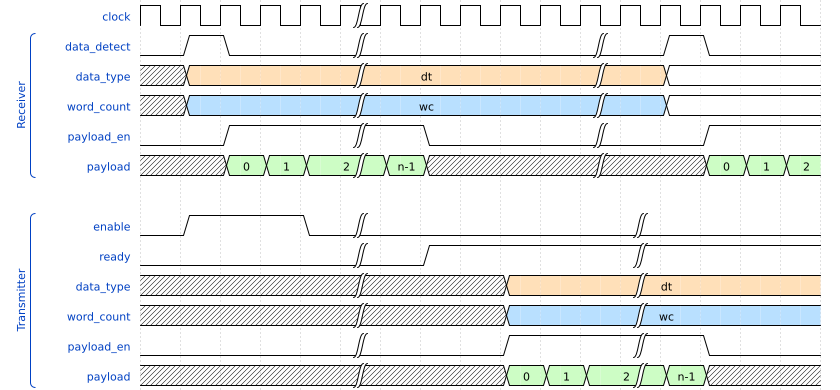 Allgemeine Info Mein Design besteht aus zwei IP-Cores: Einem Receiver und einem Transmitter. Beide nutzen dieselbe Byteclock, d.h. CDC wird nicht benötigt. Die Daten kommen am Receiver rein und bestehen aus Paket-Header und -Payload. Meine Aufgabe ist es, nur den Header der Pakete anzupassen und die Daten an den Transmitter weiterzugeben, sobald dieser bereit ist. Ablauf (siehe Bild) 1. Auf data_detect des Receivers warten 2. Header und Payload auslesen und ggf. verändern (kombinatorisch) 3. Im Transmitter enable setzen 4. Auf ready des Transmitters warten 5. Im Transmitter payload_en zusammen mit Header und Payload setzen Die payload ist 64 bit breit, also kann das n im Bild wie folgt berechnet werden: