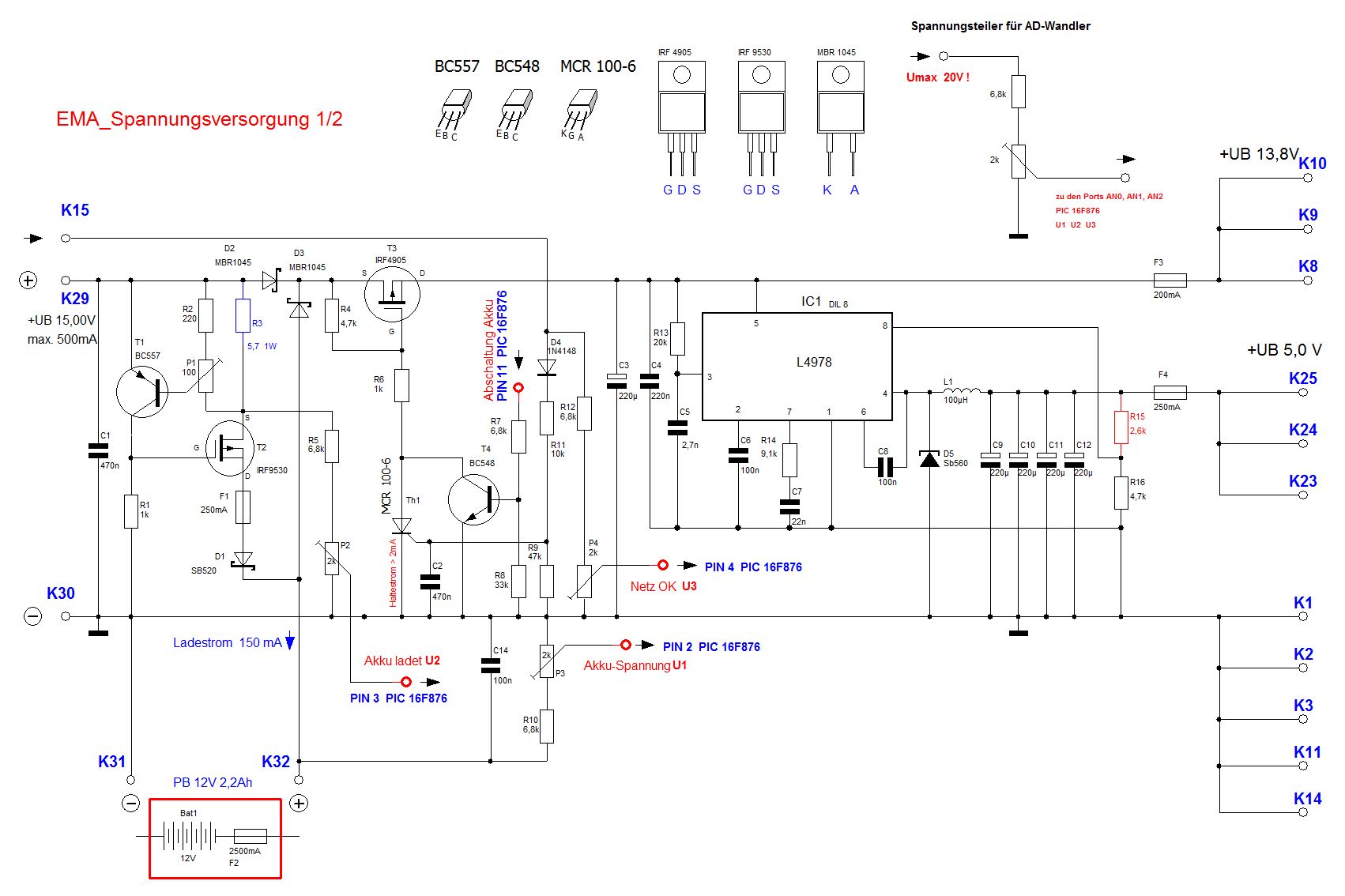 Thomas schrieb: > Thomas B. schrieb: >> Vor ein par Jahr hatte ich hier mal was geschrieben über die >> Notstromversorgung meiner >> Alarmanlage.Mit Dioden. >> Aber ich finde meinen eigenen Thread nicht mehr. > > Genau das würde ich suchen :D Ich suche mal den Schaltplan raus und scanne das neu. Kurze Beschreibung: PB_Akku 12V. (2,3Ah) Ladestrombegrenzung mit Mosfet. Entkopplung bei Netzausfall über Schottkydioden. Die 5V für den Digitalteil habe ich mit einem Schaltregler gemacht.