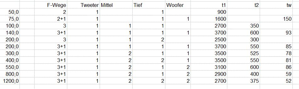Veit D. schrieb: > du kannst soviele Wege verwenden wie du lustig bist. Das heißt es kommt > nur darauf an wieviel Frequenzweichen du aufbauen möchtest. Kannst ja > für jeden 1kHz Bereich eine nehmen mit entsprechender Anzahl der > benötigten Lautsprecher. Ob das Sinn macht sei dahingestellt. Danke :-) aber darum ging es mir nicht, mir ging es darum, was schon mal in einer Box gemacht wurde. Da haben wir jetzt mit 6 Wegen den Spitzenreiter Coral BX-1500. Bietet jemand 7? Ich werde diesen Thread noch ein Weilchen beobachten... Die Frequenzaufteilung bei dieser Box ist sehr unregelmäßig, laut https://www.hifi-wiki.de/index.php/Coral_BX-1500 liegen die 5 Trennfrequenzen bei 800Hz, 1000Hz, 2000Hz, 5000Hz, 10000Hz. Der Frequenzbereich von 20 bis 20000Hz lässt sich in 10 Oktaven aufteilen. Bei einer 5 Wege Box würde ich, rein theoretisch, jedem Weg 2 Oktaven lassen. Damit käme ich auf die Trennfrequenzen 80Hz, 320Hz, 1280Hz und 5000Hz. Bei 6 Wegen würde ich vielleicht den Superhochtöner bei 10000Hz einschleifen. Dies sind natürlich nur theoretische Richtwerte, in der Praxis sollte man die Feinabstimmung der Trennfrequenzen an die erhältlichen/vorhandenen Chassis anpassen. Aber das ist alles nur Theorie, ich habe ich Moment weder vor eine Vintage-Multi-Wege-Box zu kaufen, noch mich an den Bau einer Multi-Wege-Box zu wagen.