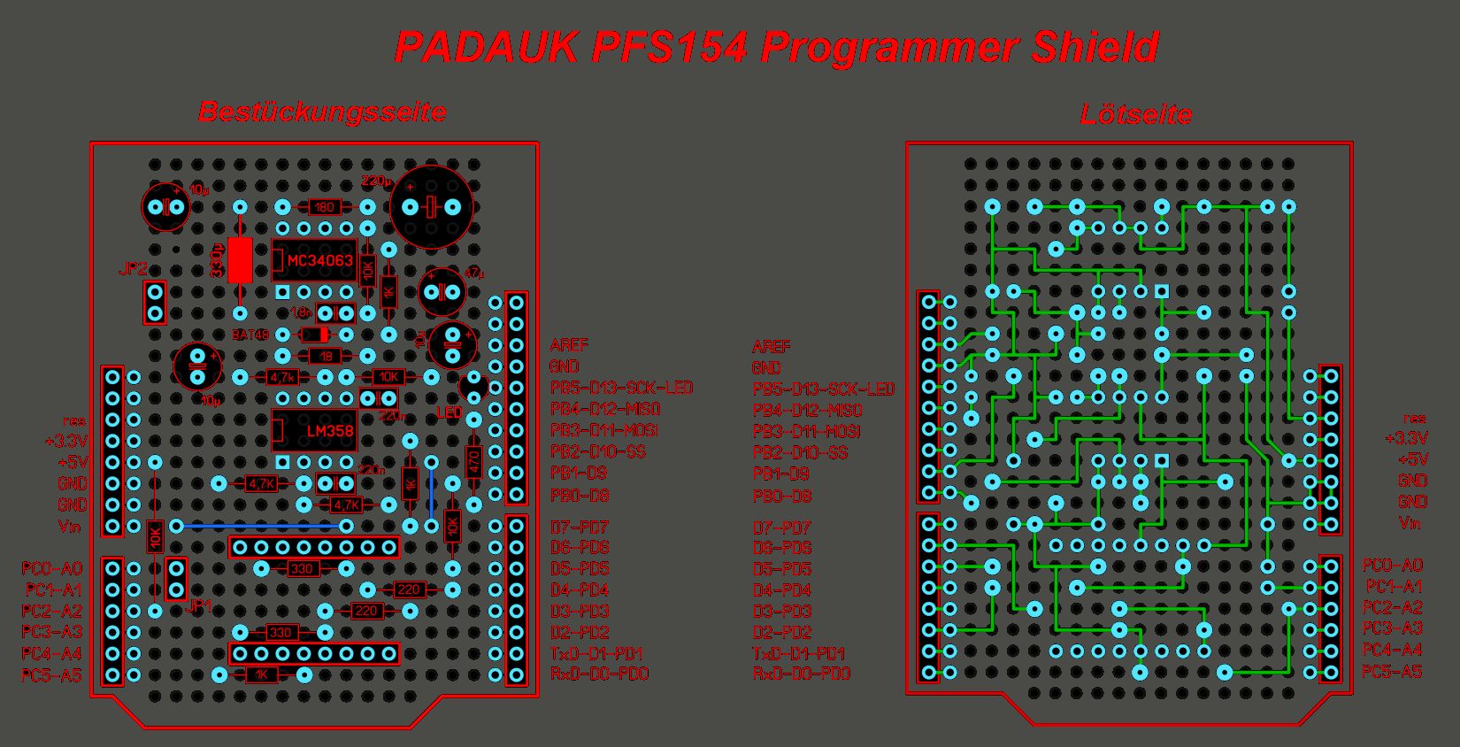 Da die Beschreibung des Projekts sehr (sehr) lange geraten ist und ich nicht jedem zumuten will alles zu lesen hier nur kurz um was es sich handelt: - absolutes DIY Projekt eines Arduino-Shields, das einen PFS154 Programmer realisiert - das ganze auf einem Lochraster - r3 Prototypen PCB mit ausschließlich bedrahteten Standardbauteilen - für Linux 64-Bit Systeme Für diejenigen die das interessiert habe ich das readme.txt File angehängt. Das gezeigt Layout funktioniert nur auf Prototypenplatinen, die zwischen den beiden Reihen 16 Pads zur Verfügung haben. Von dem Entwurf habe Gerberfiles erstellt und ich werde 5 Platinen erhalten (hoffentlich), das ganze auch deshalb, weil ich noch nie etwas bei JLCPCB bestellt habe: Ich bin gespannt (auch wenn es eigentlich eine Verschwendung ist, eine solche Platine fertigen zu lassen, hier hätte man dann noch einiges realisieren können, hätte man es in SMD gemacht).