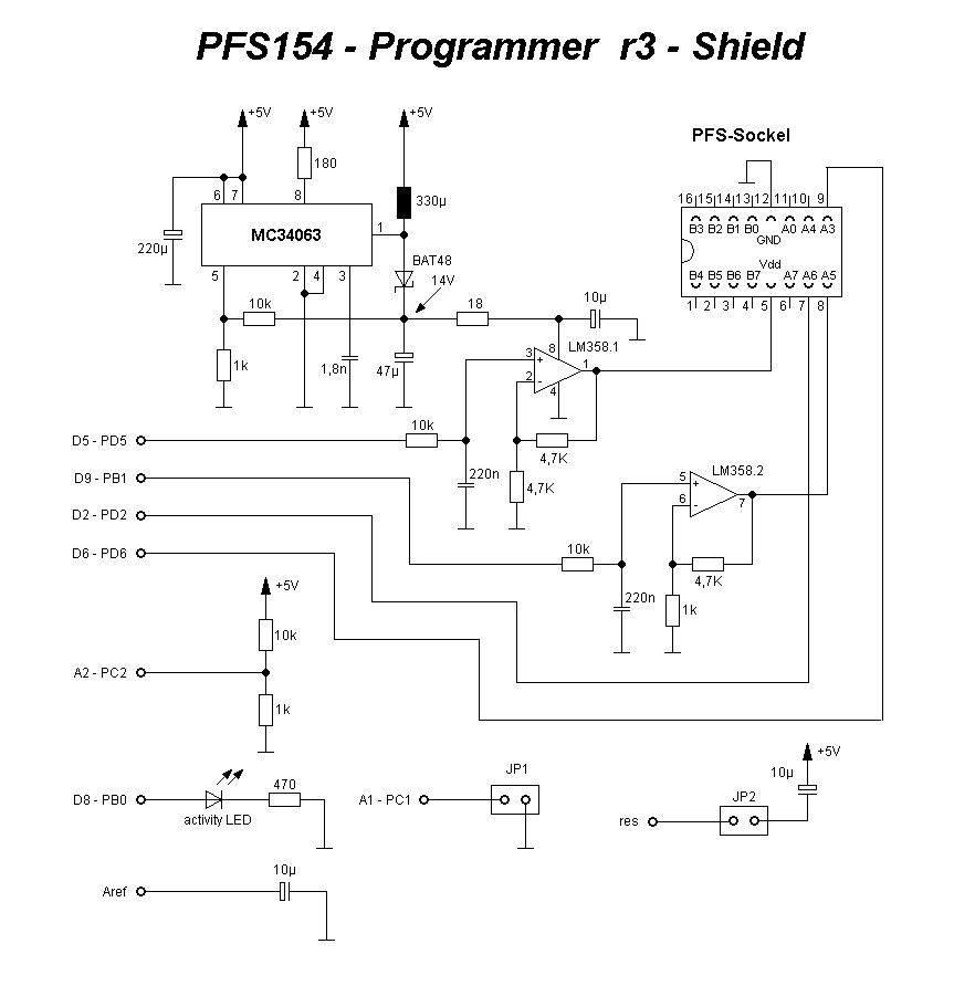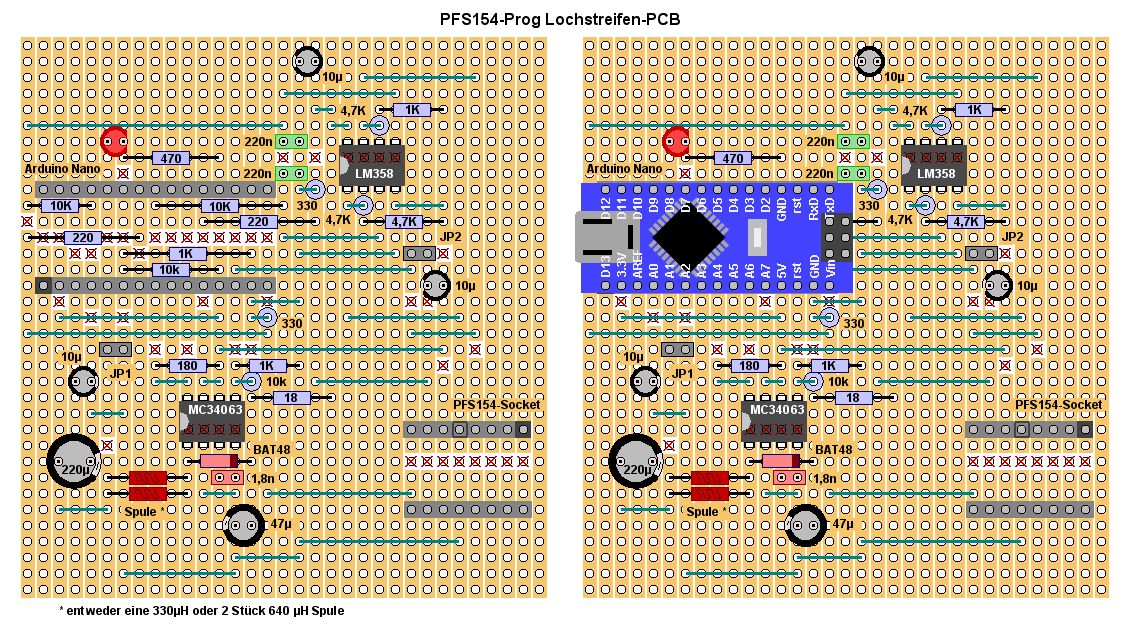 Ich bin dabei, die Schaltung um einen Analogschalter zu erweitern (mit Relais funktioniert es natürlich schon) um die Anschlußpins des PFS154 über ein Flachbandkabel mit DIP16 Verbinder nach außen zu führen, um nicht jedesmal den Chip in die Fassung zu stecken und auf einem Steckbrett experimentieren zu können, Und wenn ich da schon dabei bin, wird die Platine einen eigenen ATmega (88, 168 oder 328) beherbergen, so dass ein Arduino-Uno nicht mehr benötigt wird. Sozusagen ein "In-Circuit-Emulator" für Arme.