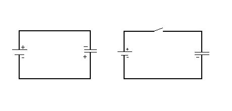 Moin moin, wir können deine Schaltung mit dem Schalter noch etwas erweitern und zwar um 1. 1 Voltmeter (Spannungsmesser) und 2. um ein Amperemeter (Strommesser). Das Voltmeter schalten wir parallel zum Kondensator und das Amperemeter legen wir in Reihe zum Kondensator. Beide Messgeräte sind ideal, das heisst das Amperemeter hat einen Widerstandswert von 0 Ohm und der Widerstandswert des Voltmeters ist unendlich hoch. Der Kondensator im Versuch ist ideal und zur Zeit entladen. Die Spannungsquelle liefert eine Spannung von 10V Nach dem Einschalten passiert jetzt folgendes: Zeit 0: Voltmeteranzeige = 0, Amperemeteranzeige = unendlich Zeit 0+1: Voltmeteranzeige =1 (Spannung steigt), Amperemeteranzeige = unendlich-1 Strom sinkt Zeit 0+2:Voltmeteranzeige =2 (Spannung steigt), Amperemeteranzeige = unendlich-2 Strom sinkt weiter Zeit 0+3:Voltmeteranzeige =3 (Spannung steigt), Amperemeteranzeige = unendlich-3 Strom sinkt weiter usw. Dies geschieht solange, bis das Voltmeter den gleichen Wert anzeigt wie die Spannungsquelle. Ist dieser Wert erreicht, zeigt das Amperemeter einen Wert von 0 an. Man sagt, der Kondensator ist nun geladen. Jetzt entferne ich die Spannungsquelle und lege sie in die Ecke. Das Voltmeter zeigt nach wie vor einen Wert von 10V an, Der fliessende Strom ist 0. Die Polarität hat sich nicht geändert. In diesem Beispiel ist alles ideal, wenn du also in 50 Jahren nachsiehst zeigt dein Voltmeter immer noch 10 Volt an und es fliesst kein Strom. Der Kondensator ist immer noch geladen. Für weitere Fragen empfehle ich dir diese Seite: www.elektronik-kompendium.de da kann dir (und alle weiteren Interessenten) bestens geholfen werden. Gruß, Günter