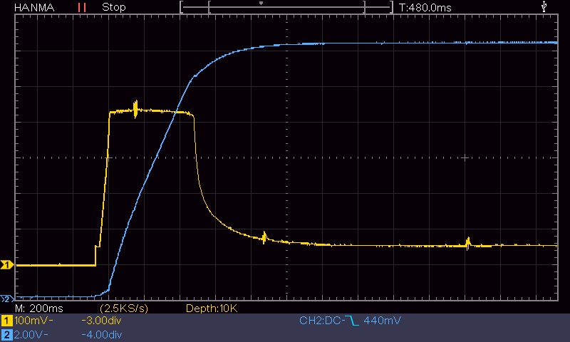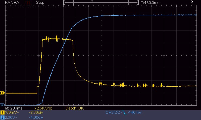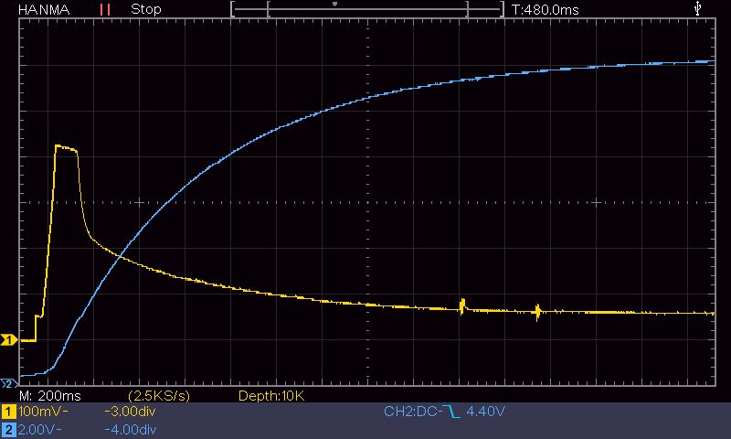Helge schrieb: > Der Ladezweig nuß kurz unterbrochen werden, wenn die Relais schalten. Beim Schalten hab ich kein Problem, da der 1000µF ja nur teilentladen wird. Siehe Anhang - da hab ich nur Ströme von 30mA, was ok ist. Die oben gezeigten Ladekurven sind beim Einschalten des Geräts. Also wenn der 1000µF komplett leer ist.