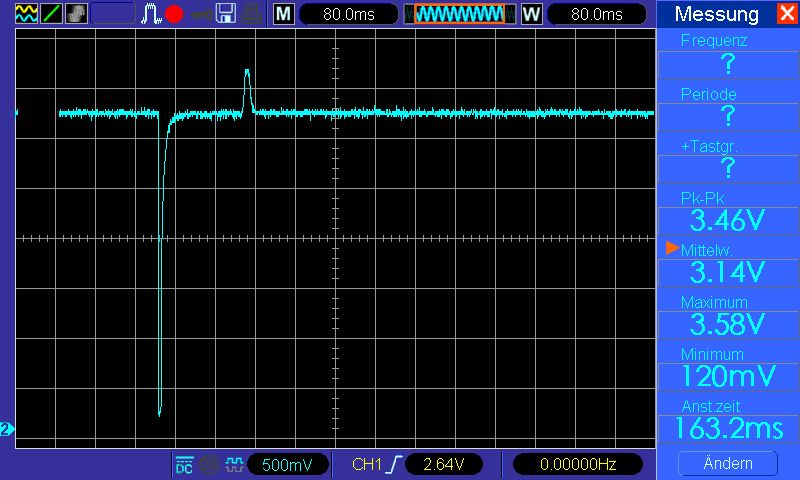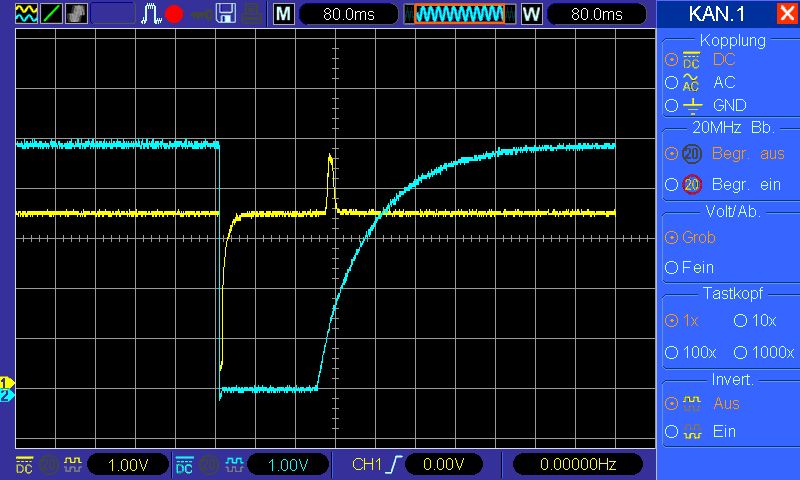 > Ja, und sogar pinkompatibel. Es reicht, wenn IC8 ein HC132 ist. Das klingt super! Danke :) > Noch immer hast du uns die Bauteilwerte nicht genannt. Wie schnell ist > dein Oszillator? Die Frequenz passen wir je nach Anzahl der zu testenden Leitungen an. Minimal 7Hz und maximal 56Hz. > Zu deinem Bild 3, gelbes Signal. Stört dich der gelbe Peak nach oben? Wo > hast du das gemessen? Am Ausgang von IC8B (also Pin 6) > Einen Peak gibt es nur nach unten, der durch die Diode gekappt wird. Die haben wir schon mal entfernt und es hat keinen Unterschied gemacht. Der Peak war immer noch vorhanden. > Und zu C10: mach dem 100Ω in Reihe, das schont den Taster. Ok danke für den Tipp, werde ich noch hinzufügen. :)