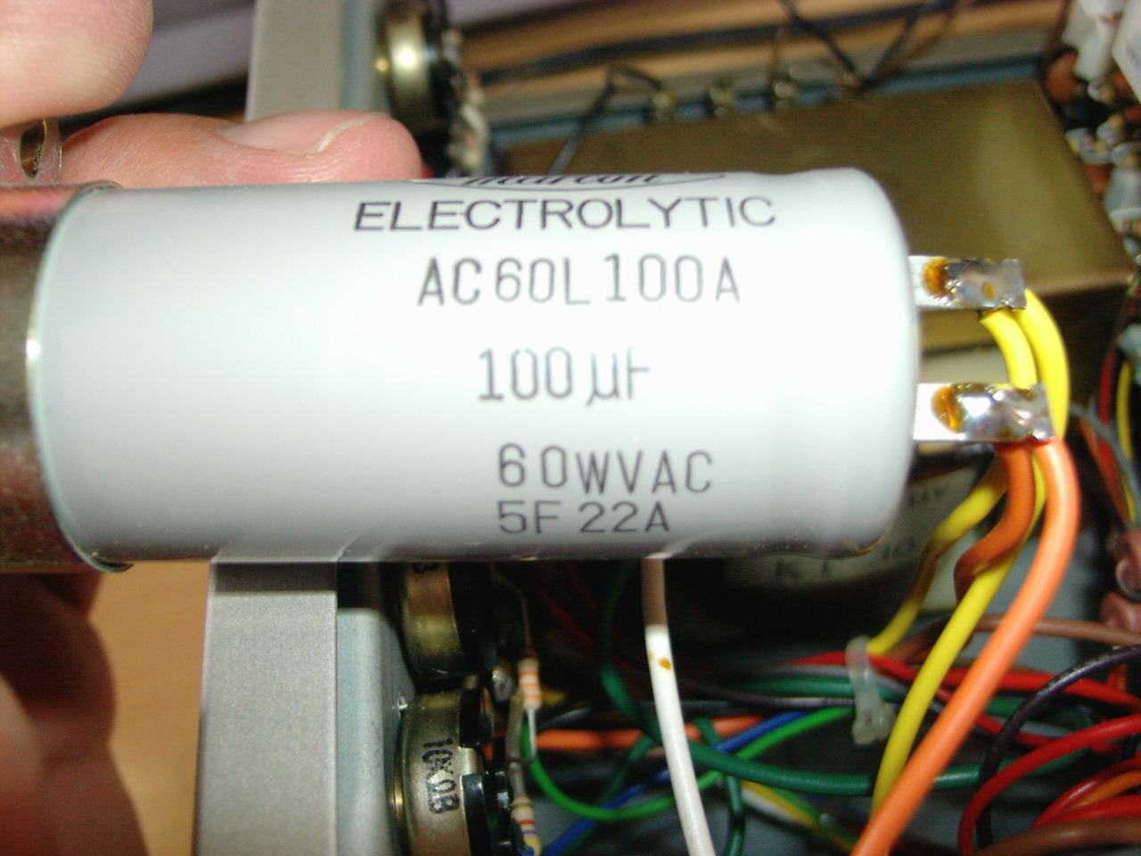 Da immerhin die Daten (100µF, 60V AC) des Kondensators bekannt sind, könnte man durch parallelschalten von 10 mal 10µF 100V Folienkondensatoren (MKS / MKT) einen Ersatz schaffen. Das wird zwar bei ca. 2 Euro pro Stück nicht besonders billig, ist aber unter Umständen trotzdem seinen Preis wert. "Normale" bipolare Elkos gibt es auch mit dieser Spannung / Kapazität, die halten allerdings den hohen Strom nicht aus.