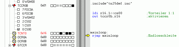 Also bei mir tuckert Timer0 des Tiny25 im Simulator... Version 4.11 Build 410 SP3 ...