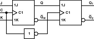 Flyffi schrieb: > Aber es scheint ja so zu sein, dass es nur einer kleinen Latenz, > unabhängig von der Taktrate, bedarf, wie hier einige und das Datenblatt > selbst anmerken. > Und das passt irgendwie nicht zu Master-Slave.. Da stimme ich dir zu. Ich halte diese Aussage auch für falsch. Master-Slave Flipflops würden noch funktionieren, wenn die Signale ohne Zeitverlust durch ihre Gatter laufen würden. > In der Wahrheitstabelle ist auch die Rede davon, > dass der Eingang keine Rolle spielt bei fallender Flanke Das ist auch richtig so. Master und Slave reagieren nicht auf Flanken, sondern auf Pegel. Erst die Verkettung der beiden Stufen bewirkt, dass das Gnaze von außen betrachtet Flankengesteuert wirkt. Der Master übernimmt die Eingangsdaten die ganze Zeit während Clock=LOW ist. Der Slave übernimmt die Daten vom Master die ganze Zeit, während Clock=HIGH ist. Damit das sauber funktioniert, muss der Eingang eine Gewisse Zeit (tsu) vor der steigenden Taktflanke stabil sein. Vergleiche das mit dem angehängten Schaltplan, dass die Innenschaltung eines Master-Slave Flipflops zeigt. Im Vergleich zu deinem IC ist dort der Clock Eingang invertiert. Der Master übernimmt bei Clock=HIGH und der Slave bei Clock=LOW. Das Funtkionsprinzip ist ansonsten gleich. Siehe https://www.elektronik-kompendium.de/sites/dig/0210221.htm