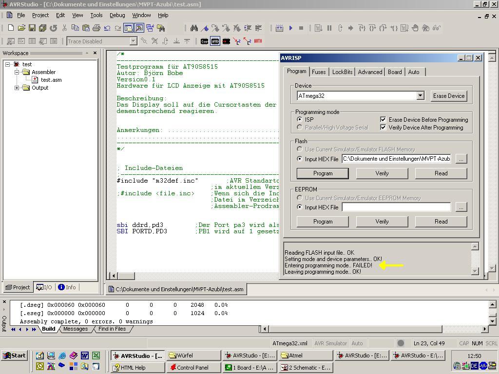 Dein Programmer: Das wäre schon wichtig zu wissen welcher das ist. AVR-Studio kommt nicht mit allen Programmern zurecht. Wie sieht er dann aus? Kannst du ein Bild posten?