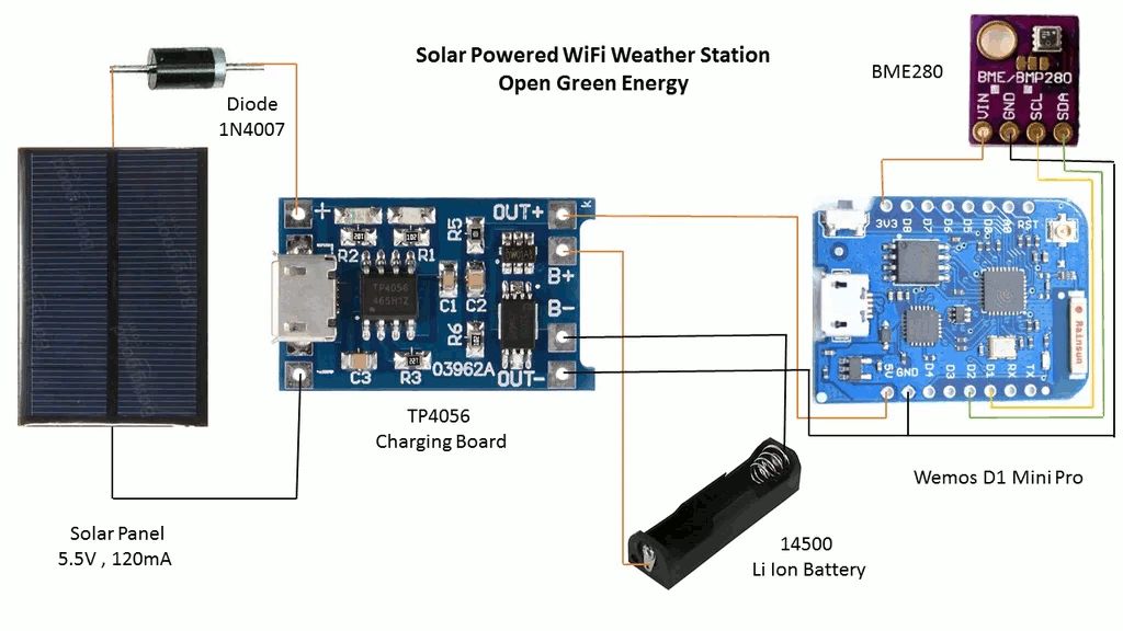 Ok ich beschreibe alles. Also ich habe einen Wemos D1 Mini pro der als Wetterstation arbeitet. Der Wemos D1 Mini Pro wird über einen Akku 18650 3,7V mit Strom versorgt was auch funktioniert. Jetzt habe ich einen TP4056 Laderegler an den eine Solarzelle angeschlossen ist. An den Solarregler TP4056 ist auch der Akku und der Wemos D1 Mini pro angeschlossen. Was ich damit erreichen möchte ist, das die Solarzelle den Akku wieder aufladen soll und sich der Wemos D1 Mini Pro an bei dem Akku bedient. Der Laderegler TP4056 hat auch einen USB Anschluss ueber den ich den Akku auch aufladen kann was mir mit einer gruenen und roten LED angezeigt wird (rot = Laden) (gruen = Voll). Hab ich alle Komponenten Angeschlossen, habe ich am Wemos D1 Mini Pro 4,1V und am Akku 4,1V. Die Solarzelle liefert auch Spannung zwischen 2,0V ubnd 4,1V (je nach Lichtverhaeltniss) Die zwei LED's die anzeigen ob dder Akku geladen wird oder voll ist zeigen keinen zustand an. Desweiteren ist eine Sperr-Diode 1N4007 in der + Leitung von der Solarzelle verbaut um Rueckspannung zu vermeiden. An der diode ist ein faellt eine Spannung von 0,5V ab (bitte berichtigen falls ich nicht richtig liege).| Leider kann ich so nicht feststellen ob der Akku geladen wird oder nicht. Das ganze habe ich nach einer Anleitung gebaut siehe Link https://www.instructables.com/Solar-Powered-WiFi-Weather-Station/