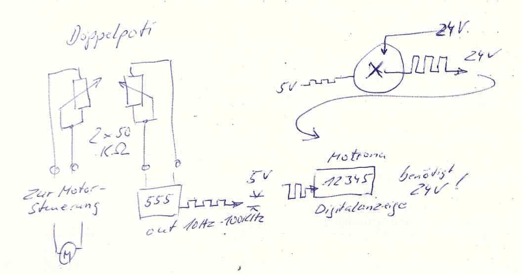Sorry schon mal für die Frage, welche für Elektroniker sicher kein Problem darstellt, auch wenn dadurch meine Recherchefaulheit unterstützt wird. Ich habe einen einfachen Frequenzgenerator (555) gebaut, der 10Hz bis 10kHz mit 5V Spitze liefert.Die Frequenz wird mit einem 50k Poti verändert Es ist ein Doppelpoti, dessen zweite Ebene einen Motor in der Drehzahl verändert. Durch die Frequenz soll die ungefähre Drehzahl des Motors angezeigt werden, da eine direkte Drehzahlabnahme nicht möglich ist. Die richtige Drehzahl ist nicht wichtig. Die Anzeige soll nur ungefähr anzeigen, wenn der Motor mal höher drehen soll. Die Frequenz wird auf ein Anzeigegerät (Digitalanzeige) gegeben,um eine ungefähre Stellung des Potis anzuzeigen. Das Anzeigerät verlangt jetzt eine Eingangsspannung von 15-24 Volt. Wie verstärke ich "möglichst einfach" die 5 Volt auf ~24V bei dem o.g. Frequenzbereich? Handskizze zeigt hoffentlich, was ich meine. Für einen Tip oder Link dankt im voraus ein "Denkfauler"